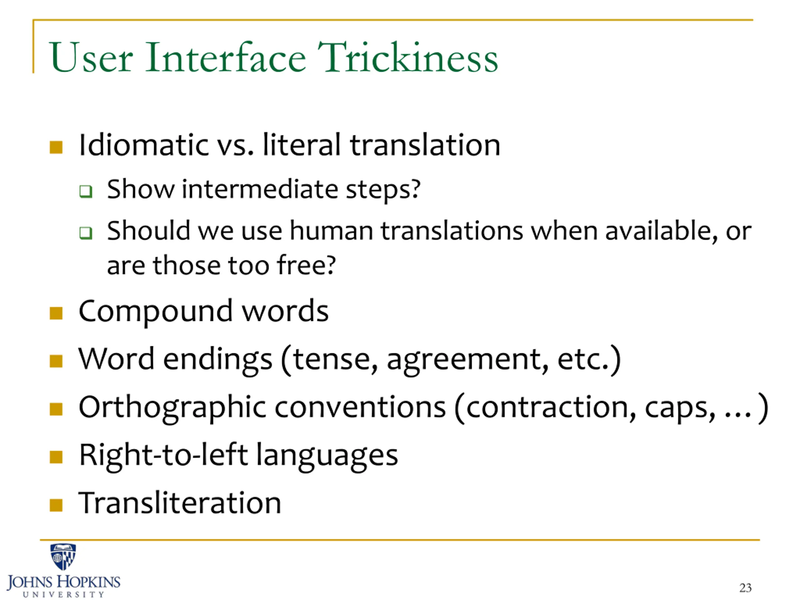 User Interface Trickiness Idiomatic vs. literal translation Show intermediate steps? Should we use human translations when available, or are those too free? Compound words Word endings (tense, agreement, etc.) Orthographic conventions (contraction, caps, ) Right-to-left languages Transliteration 23