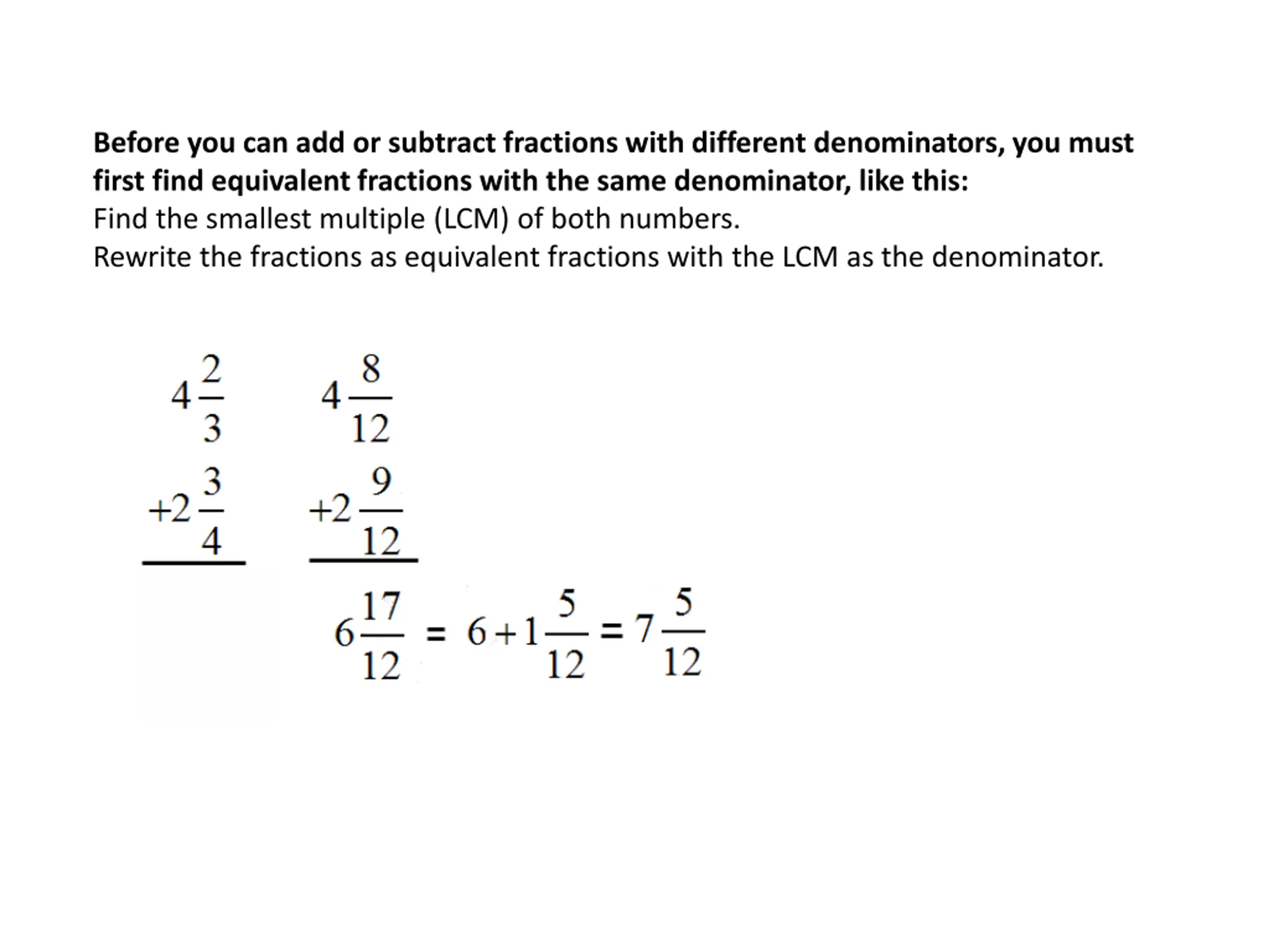 Before you can add or subtract fractions with different denominators, you must first find equivalent fractions with the same denominator, like this: Find the smallest multiple (LCM) of both numbers. Rewrite the fractions as equivalent fractions with the LCM as the denominator.