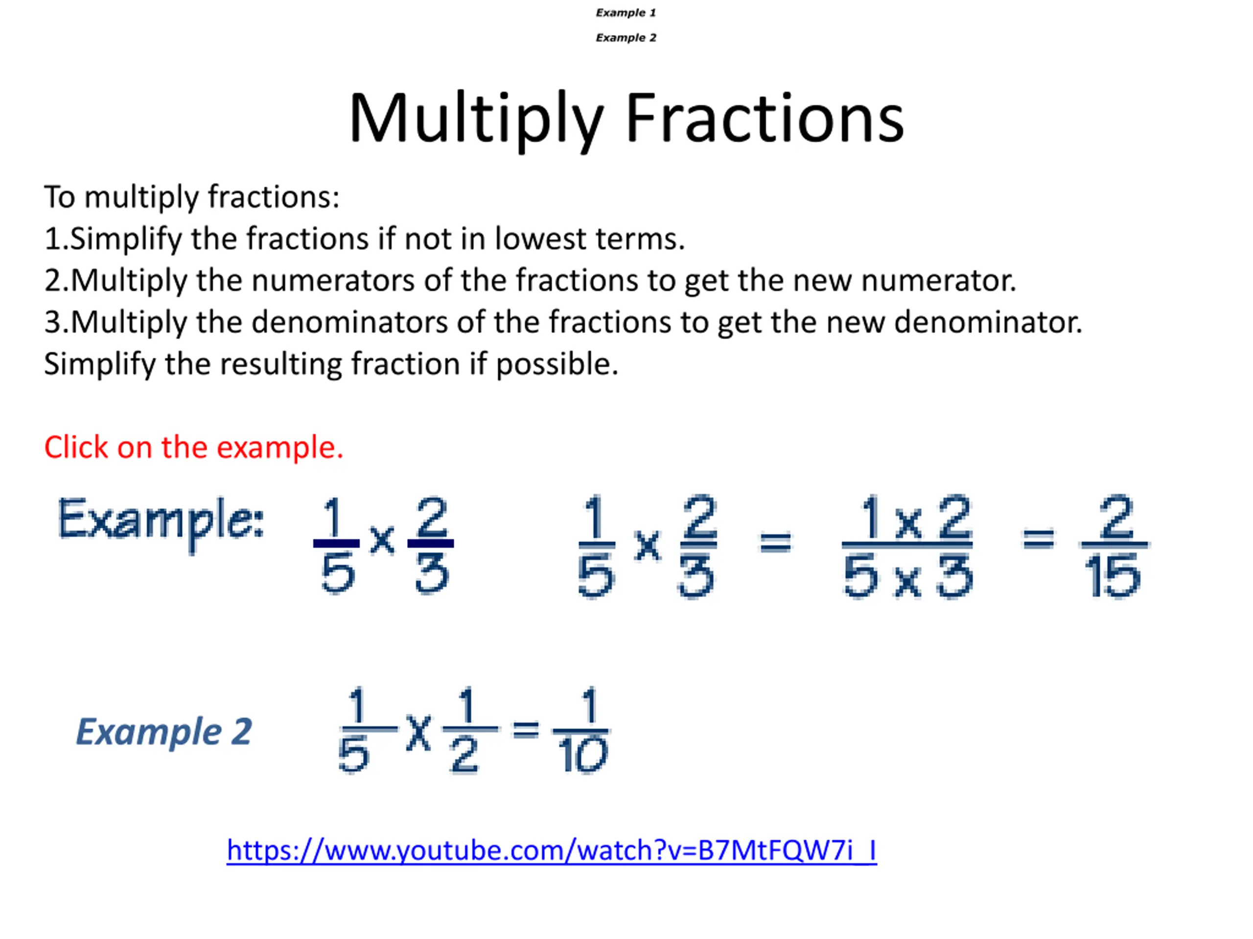 Example 1 Example 2 Multiply Fractions To multiply fractions: 1.Simplify the fractions if not in lowest terms. 2.Multiply the numerators of the fractions to get the new numerator. 3.Multiply the denominators of the fractions to get the new denominator. Simplify the resulting fraction if possible. Click on the example. http://www.math.com/school/subject1/images/S1U4L4GLex.gif Example 2 https://www.youtube.com/watch?v=B7MtFQW7i_I