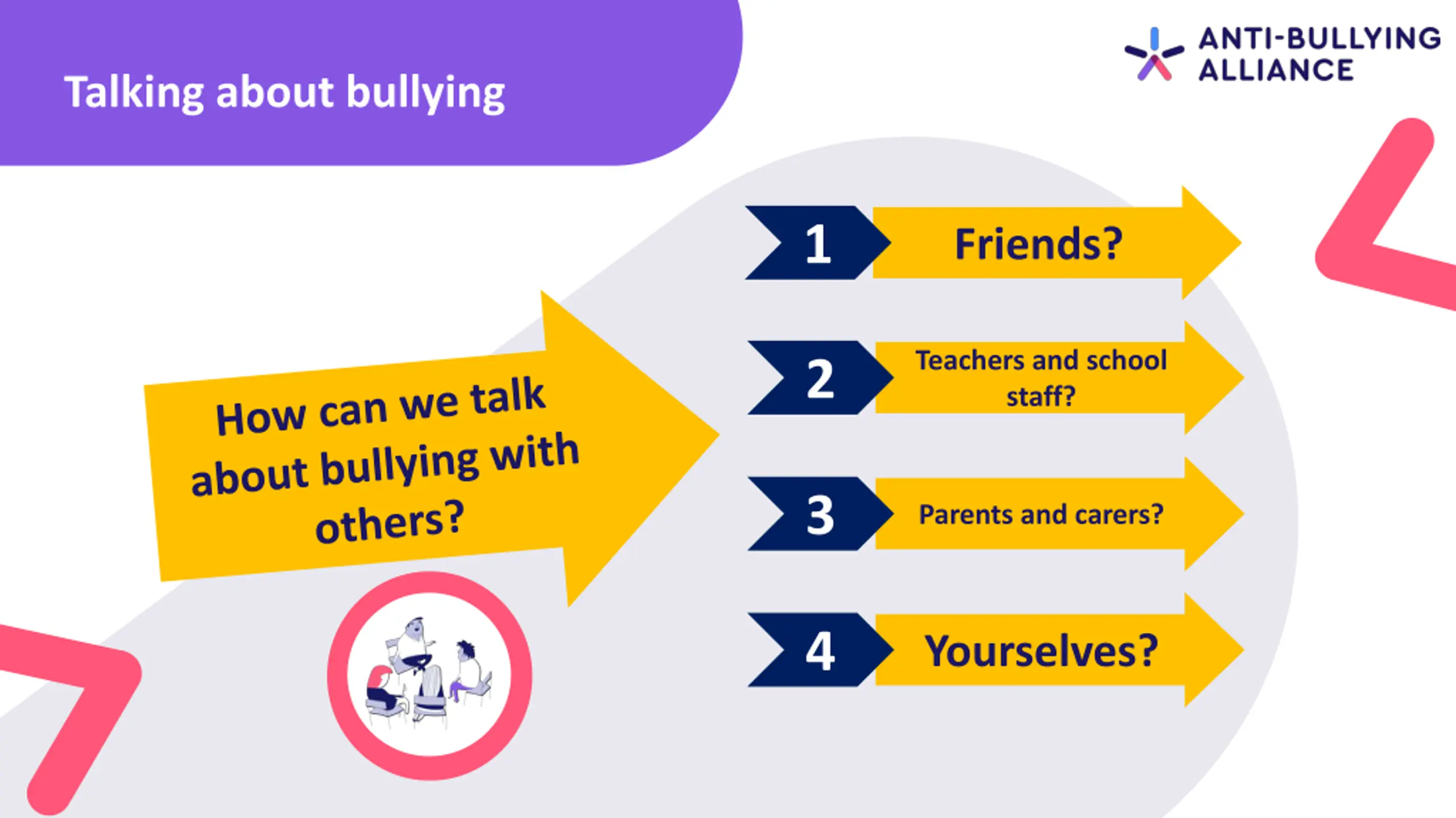 Talking about bullying 1 Friends? Teachers and school staff? 2 3 Parents and carers? 4 Yourselves?