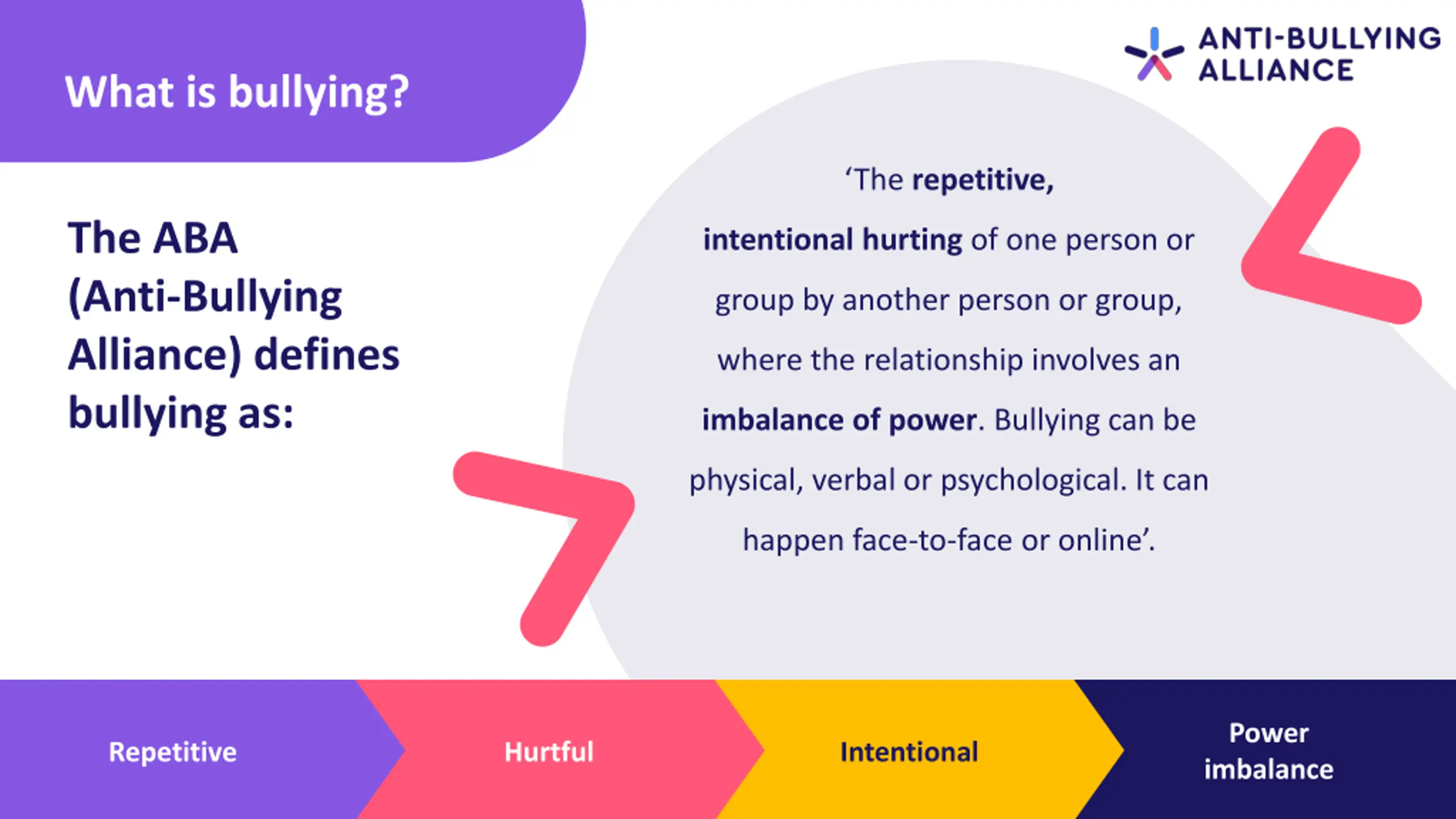 What is bullying? The repetitive, The ABA (Anti-Bullying Alliance) defines bullying as: intentional hurting of one person or group by another person or group, where the relationship involves an imbalance of power. Bullying can be physical, verbal or psychological. It can happen face-to-face or online . Power imbalance Repetitive Hurtful Intentional