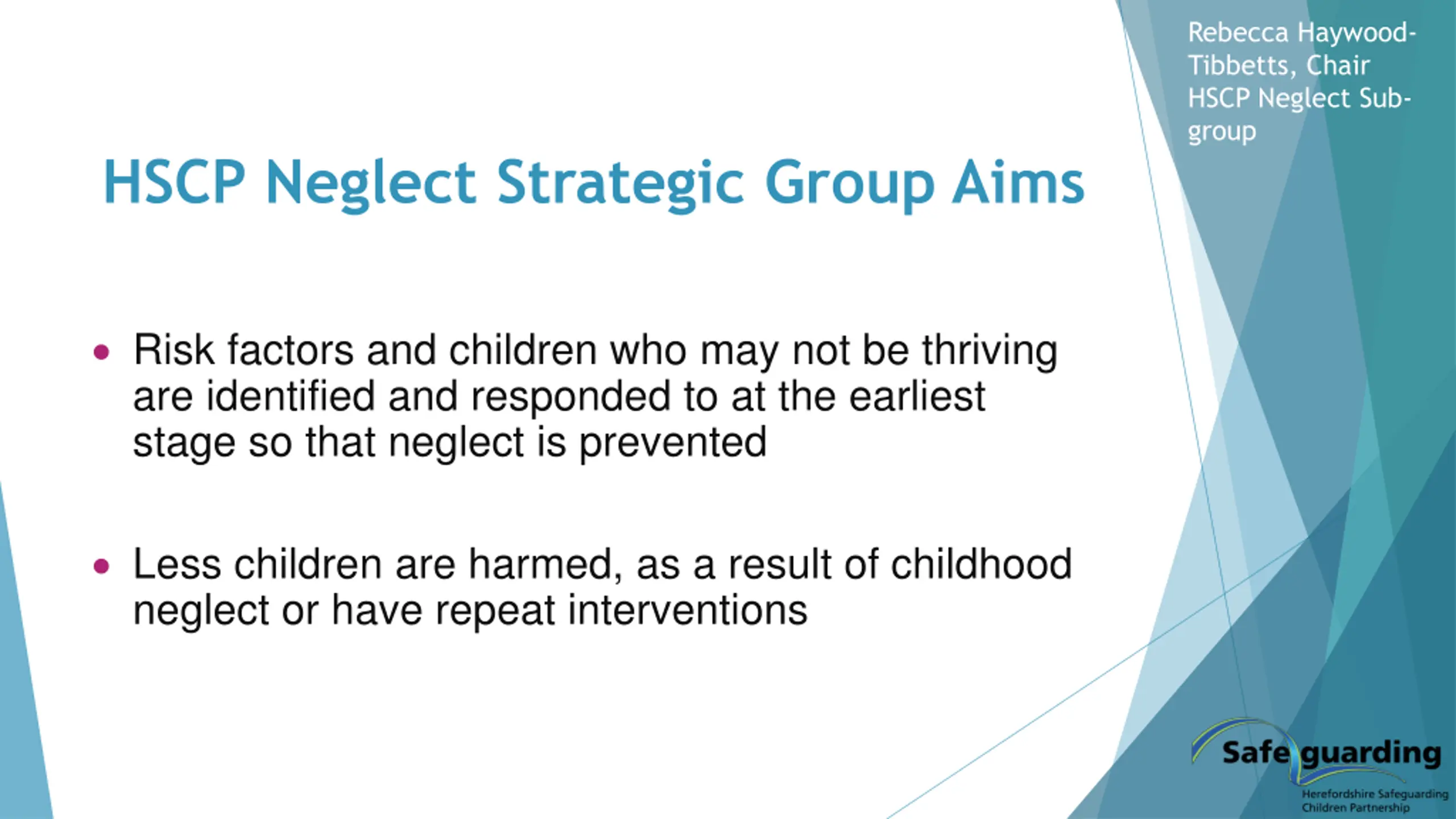 Rebecca Haywood- Tibbetts, Chair HSCP Neglect Sub- group HSCP Neglect Strategic Group Aims Multi-agency strategic leadership prioritises and drives tackling childhood neglect in Herefordshire Partners and our workforce are well informed, competent, and work well together to prevent, identify and tackle neglect.