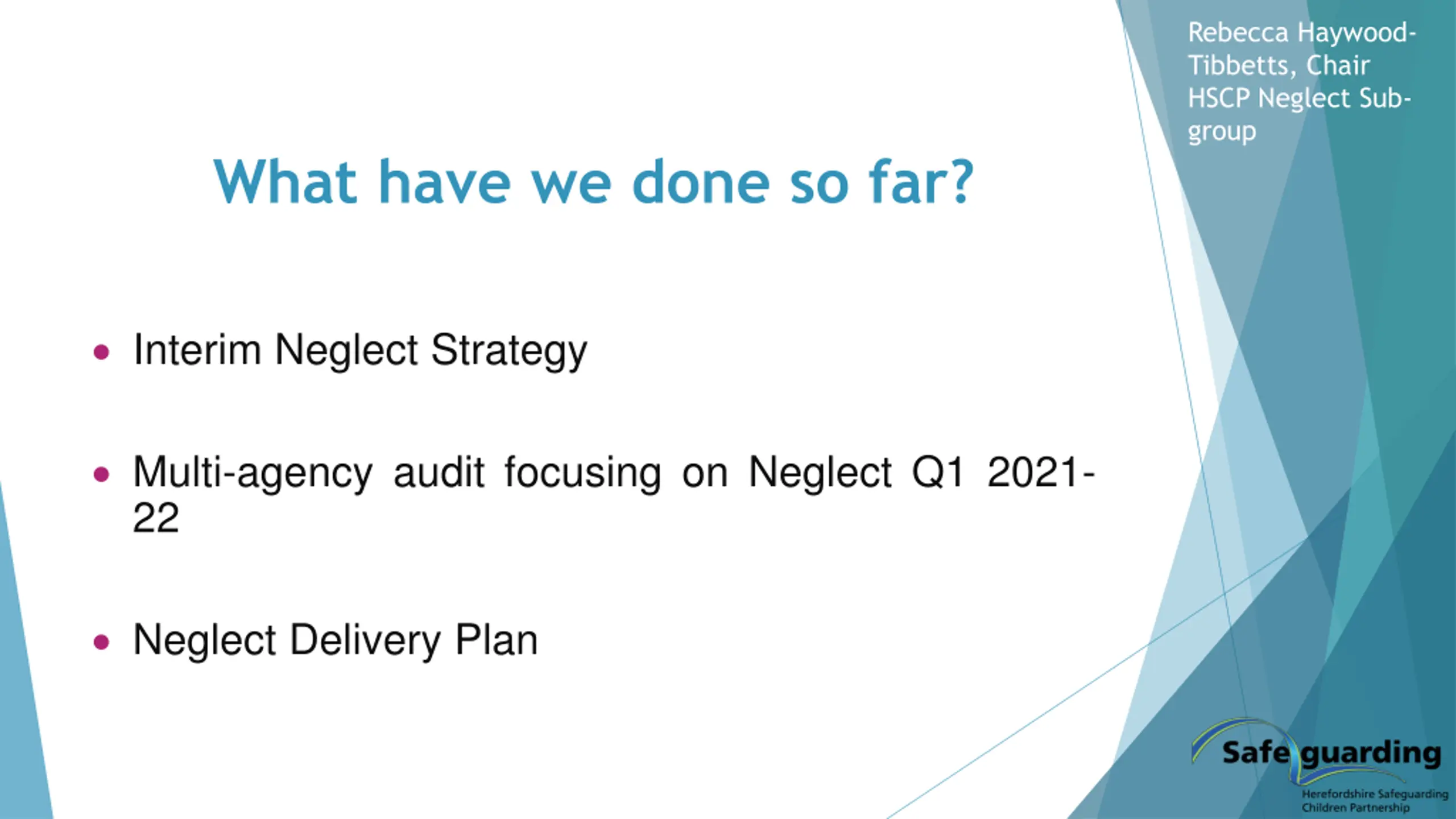 Rebecca Haywood- Tibbetts, Chair HSCP Neglect Sub- group What have we done so far? Interim Neglect Strategy Multi-agency audit focusing on Neglect Q1 2021- 22 Neglect Delivery Plan