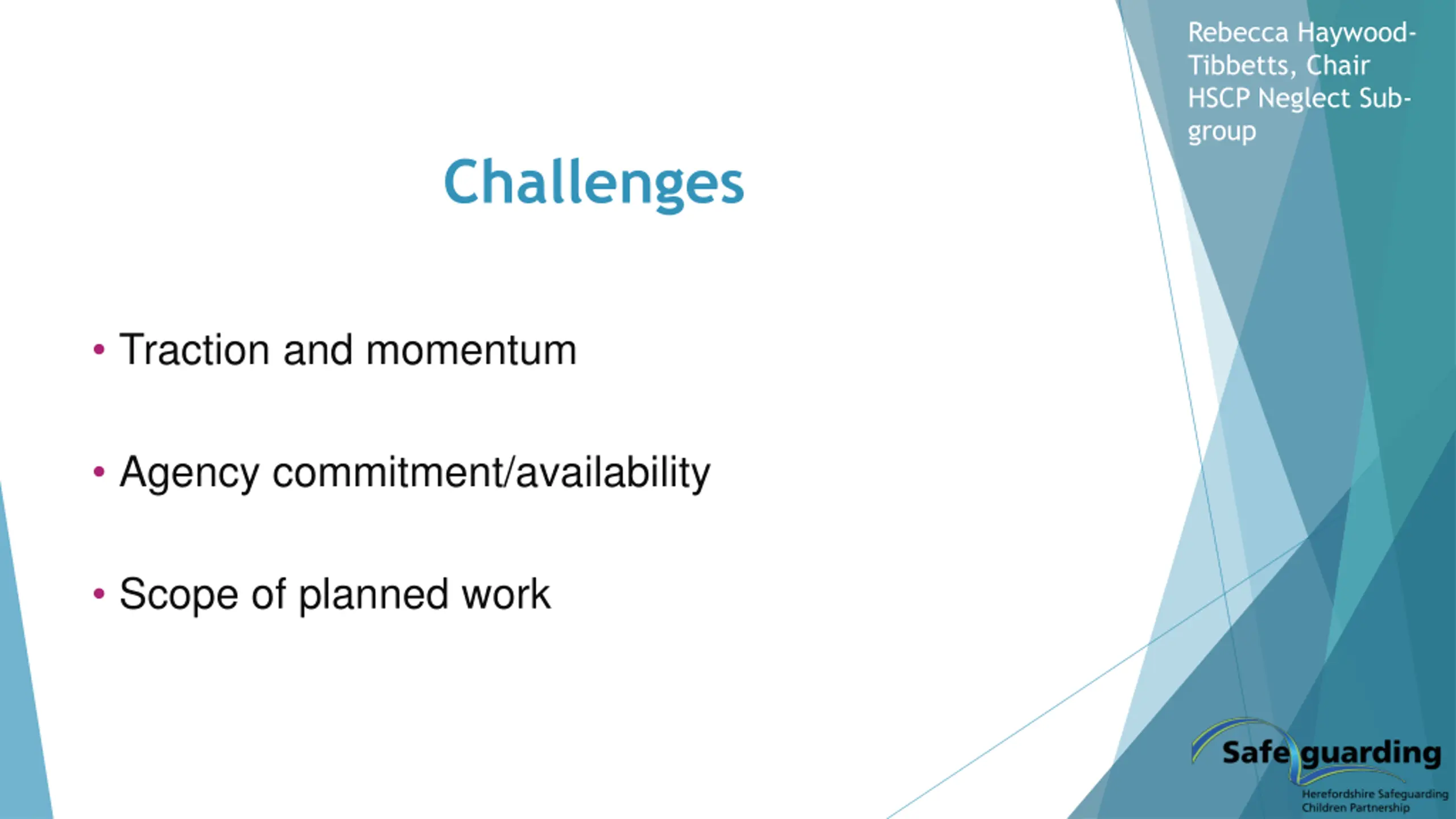 Rebecca Haywood- Tibbetts, Chair HSCP Neglect Sub- group Challenges Traction and momentum Agency commitment/availability Scope of planned work