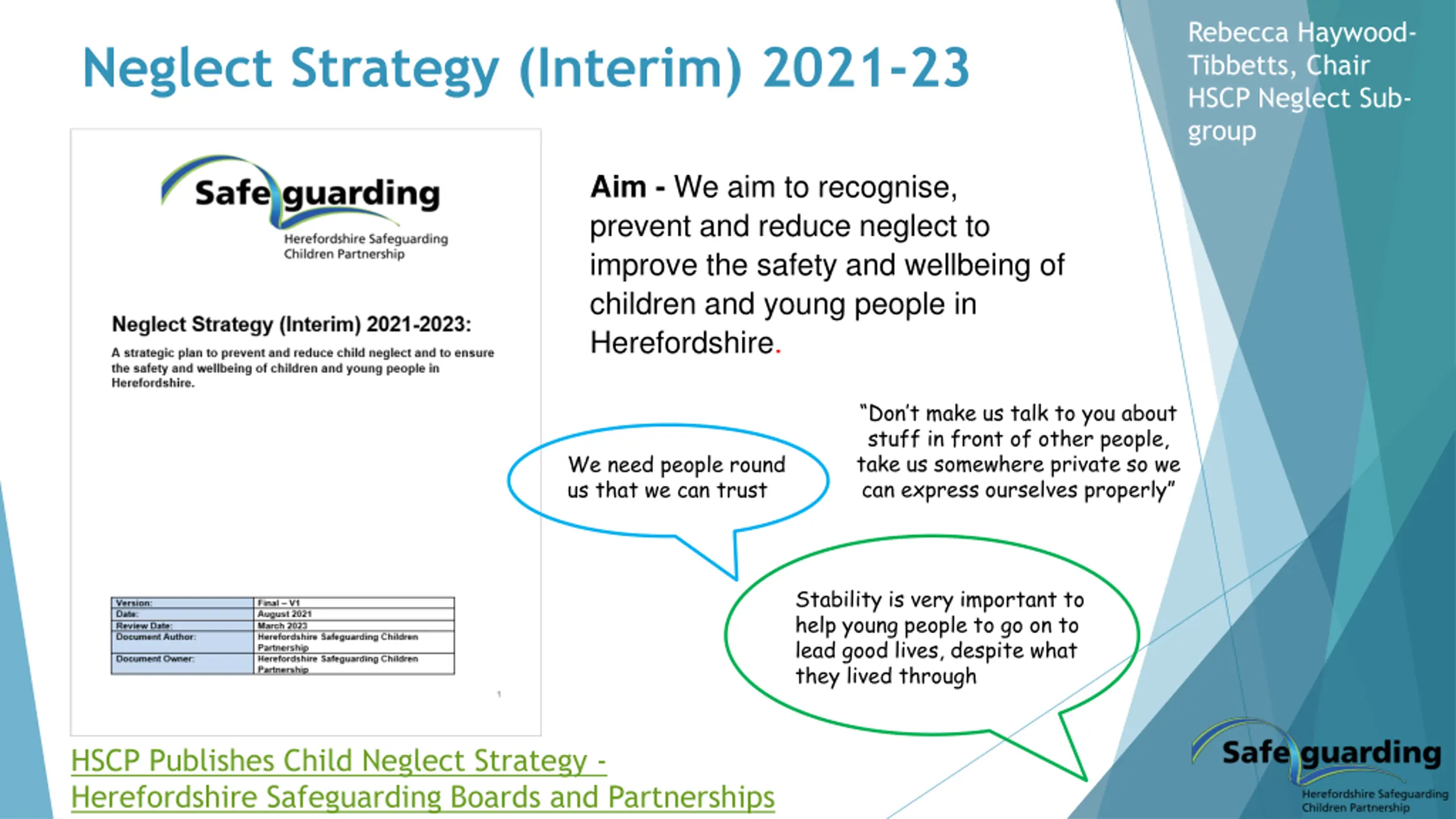 Rebecca Haywood- Tibbetts, Chair HSCP Neglect Sub- group Neglect Strategy (Interim) 2021-23 Aim - We aim to recognise, prevent and reduce neglect to improve the safety and wellbeing of children and young people in Herefordshire. Don t make us talk to you about stuff in front of other people, take us somewhere private so we can express ourselves properly We need people round us that we can trust Stability is very important to help young people to go on to lead good lives, despite what they lived through HSCP Publishes Child Neglect Strategy - Herefordshire Safeguarding Boards and Partnerships