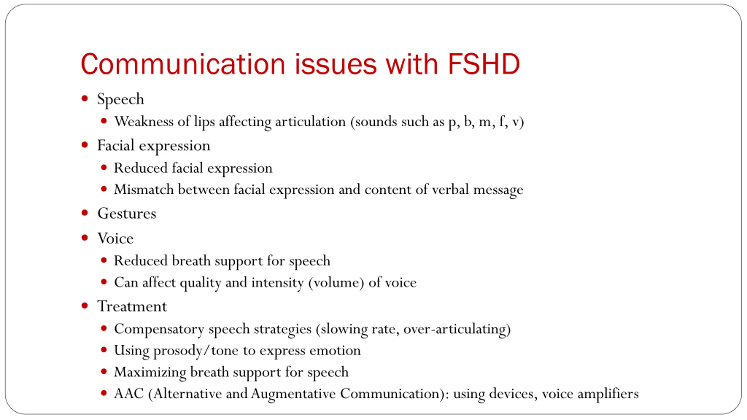 Communication issues with FSHD Speech Weakness of lips affecting articulation (sounds such as p, b, m, f, v) Facial expression Reduced facial expression Mismatch between facial expression and content of verbal message Gestures Voice Reduced breath support for speech Can affect quality and intensity (volume) of voice Treatment Compensatory speech strategies (slowing rate, over-articulating) Using prosody/tone to express emotion Maximizing breath support for speech AAC (Alternative and Augmentative Communication): using devices, voice amplifiers