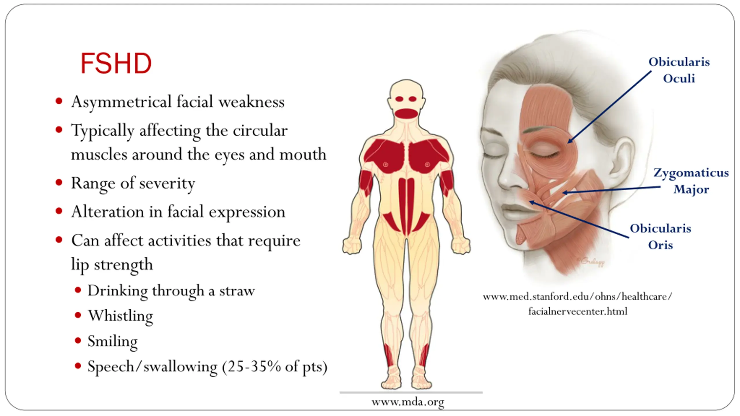 FSHD Obicularis Oculi Asymmetrical facial weakness Typically affecting the circular muscles around the eyes and mouth Range of severity Alteration in facial expression Can affect activities that require lip strength Drinking through a straw Whistling Smiling Speech/swallowing (25-35% of pts) Zygomaticus Major Obicularis Oris www.med.stanford.edu/ohns/healthcare/ facialnervecenter.html www.mda.org