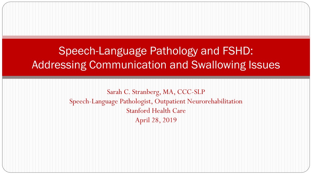 Speech-Language Pathology and FSHD: Addressing Communication and Swallowing Issues Sarah C. Stranberg, MA, CCC-SLP Speech-Language Pathologist, Outpatient Neurorehabilitation Stanford Health Care April 28, 2019