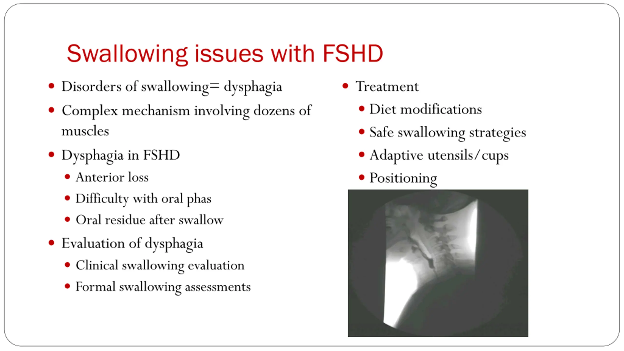 Swallowing issues with FSHD Disorders of swallowing= dysphagia Complex mechanism involving dozens of muscles Dysphagia in FSHD Anterior loss Difficulty with oral phas Oral residue after swallow Evaluation of dysphagia Clinical swallowing evaluation Formal swallowing assessments Treatment Diet modifications Safe swallowing strategies Adaptive utensils/cups Positioning