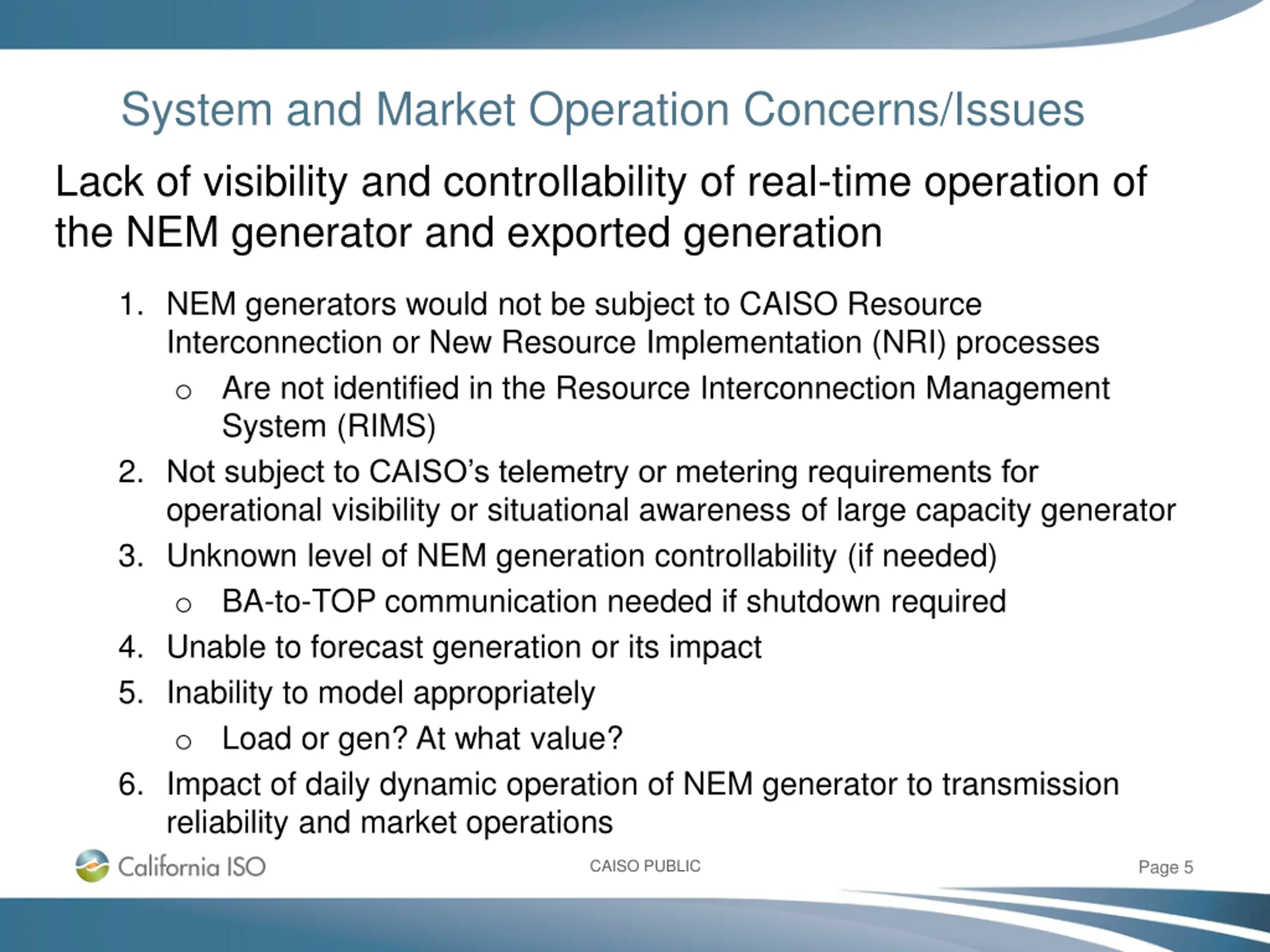 System and Market Operation Concerns/Issues Lack of visibility and controllability of real-time operation of the NEM generator and exported generation 1. NEM generators would not be subject to CAISO Resource Interconnection or New Resource Implementation (NRI) processes o Are not identified in the Resource Interconnection Management System (RIMS) 2. Not subject to CAISO s telemetry or metering requirements for operational visibility or situational awareness of large capacity generator 3. Unknown level of NEM generation controllability (if needed) o BA-to-TOP communication needed if shutdown required 4. Unable to forecast generation or its impact 5. Inability to model appropriately o Load or gen? At what value? 6. Impact of daily dynamic operation of NEM generator to transmission reliability and market operations CAISO PUBLIC Page 5