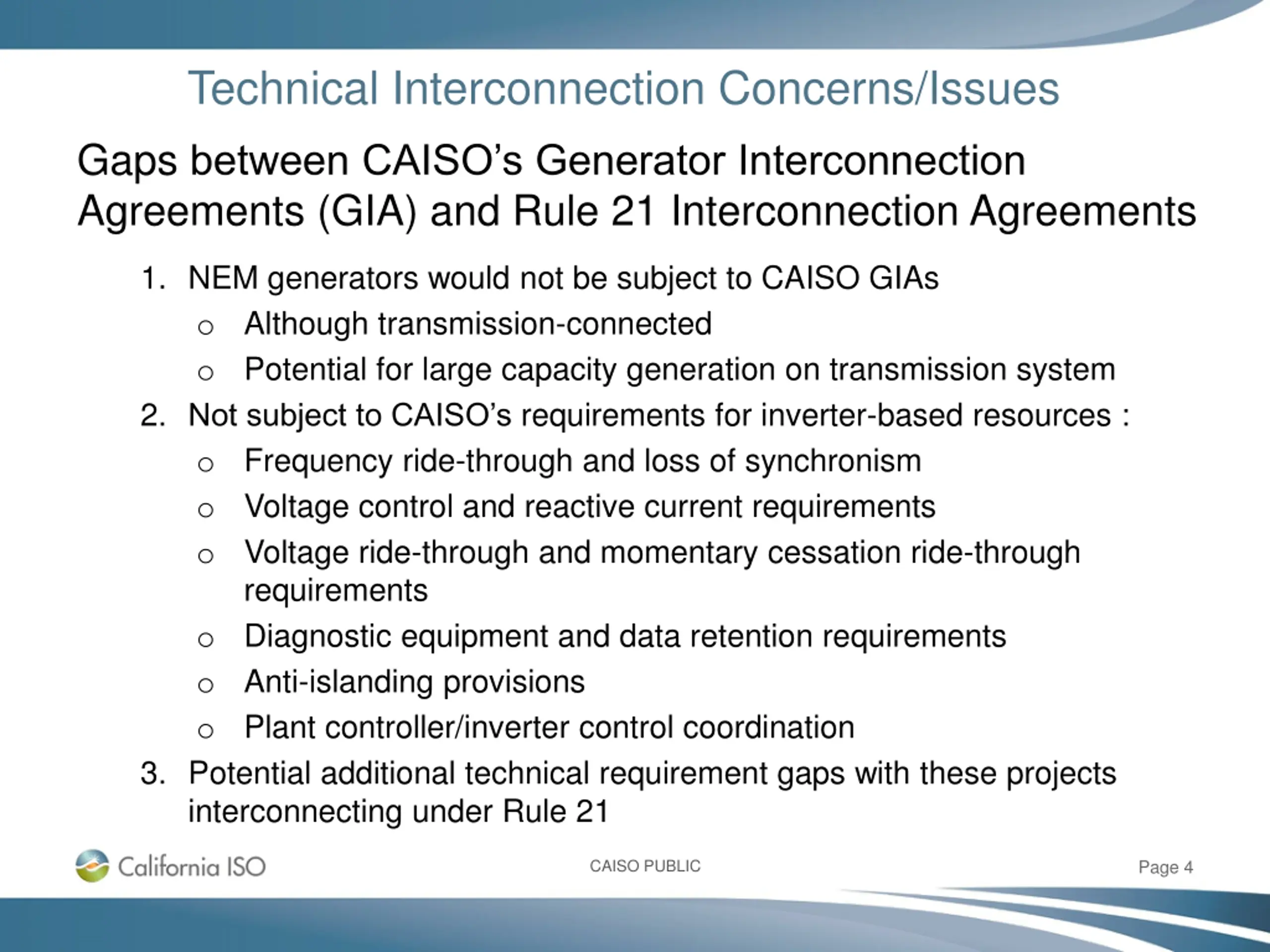 Planning Concerns/Issues Concerns with current lack of required coordination on large- scale NEM projects during study process 1. Currently no obligation to be notified of projects studied under Rule 21 interconnection 2. No tariff obligation to share study results to ensure system will see no harm from interconnection. 3. CAISO unable to advise or inform PTOs on the studies until they are complete or until NEM generation is operational 4. Lack of participation within CAISO coordination regarding affected systems CAISO PUBLIC Page 3