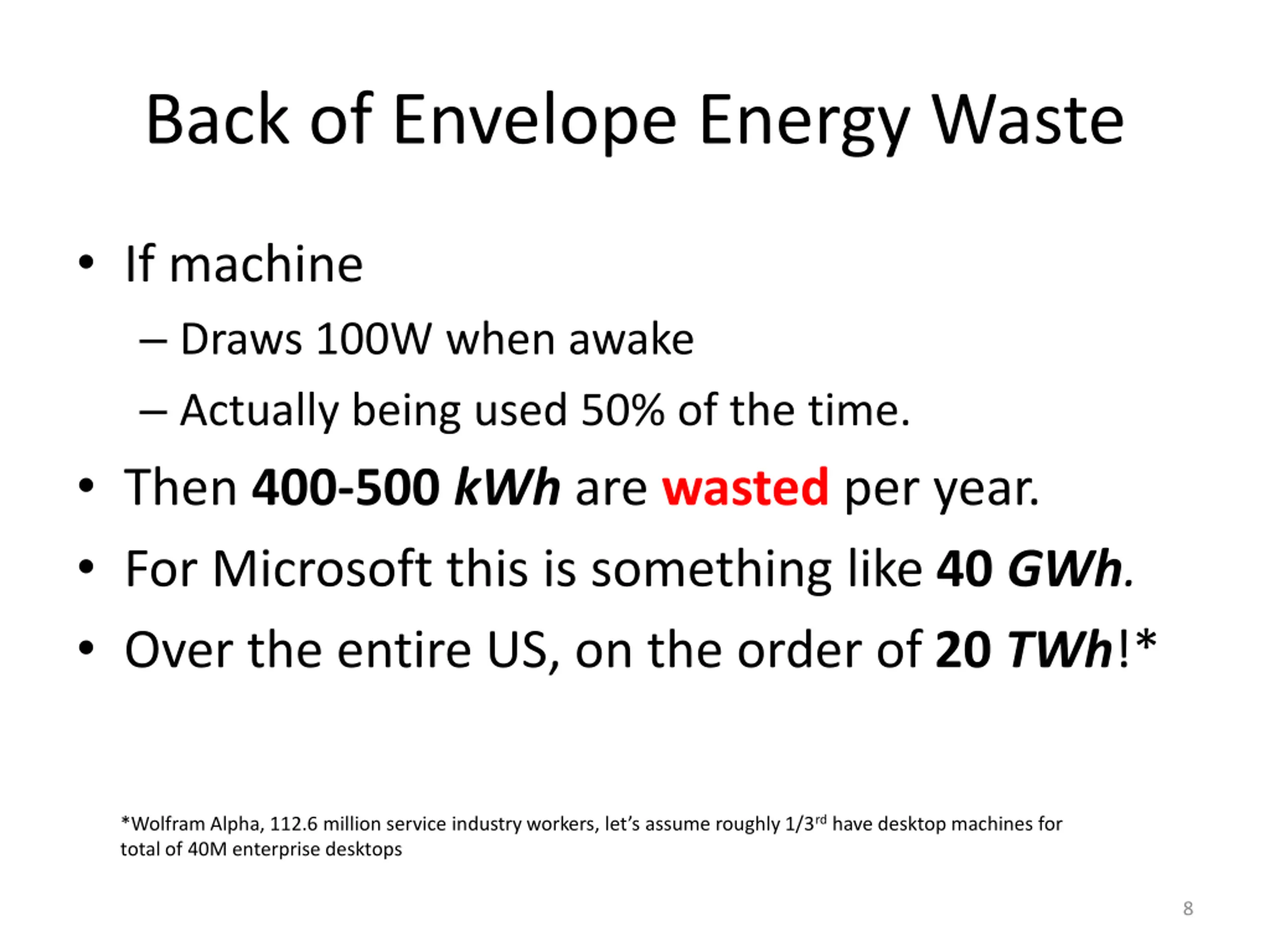 Back of Envelope Energy Waste If machine Draws 100W when awake Actually being used 50% of the time. Then 400-500 kWh are wasted per year. For Microsoft this is something like 40 GWh. Over the entire US, on the order of 20 TWh!* *Wolfram Alpha, 112.6 million service industry workers, let s assume roughly 1/3rd have desktop machines for total of 40M enterprise desktops 8