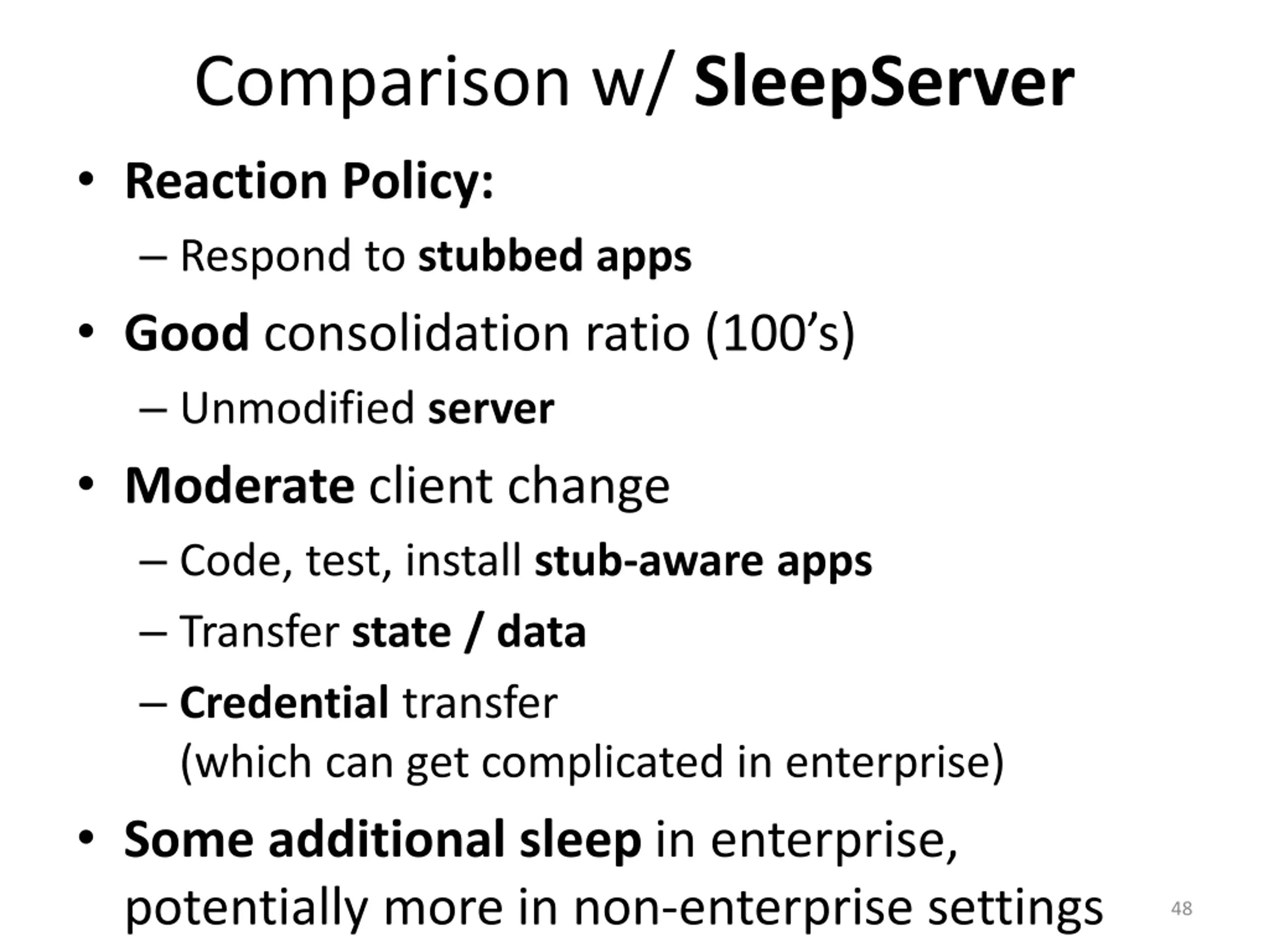 Comparison w/ SleepServer Reaction Policy: Respond to stubbed apps Goodconsolidation ratio (100 s) Unmodified server Moderate client change Code, test, install stub-aware apps Transfer state / data Credential transfer (which can get complicated in enterprise) Some additional sleep in enterprise, potentially more in non-enterprise settings 48
