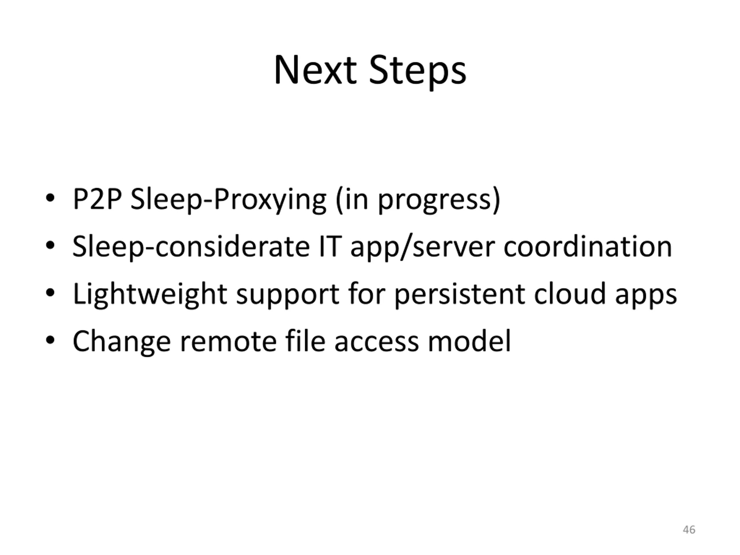 Next Steps P2P Sleep-Proxying (in progress) Sleep-considerate IT app/server coordination Lightweight support for persistent cloud apps Change remote file access model 46