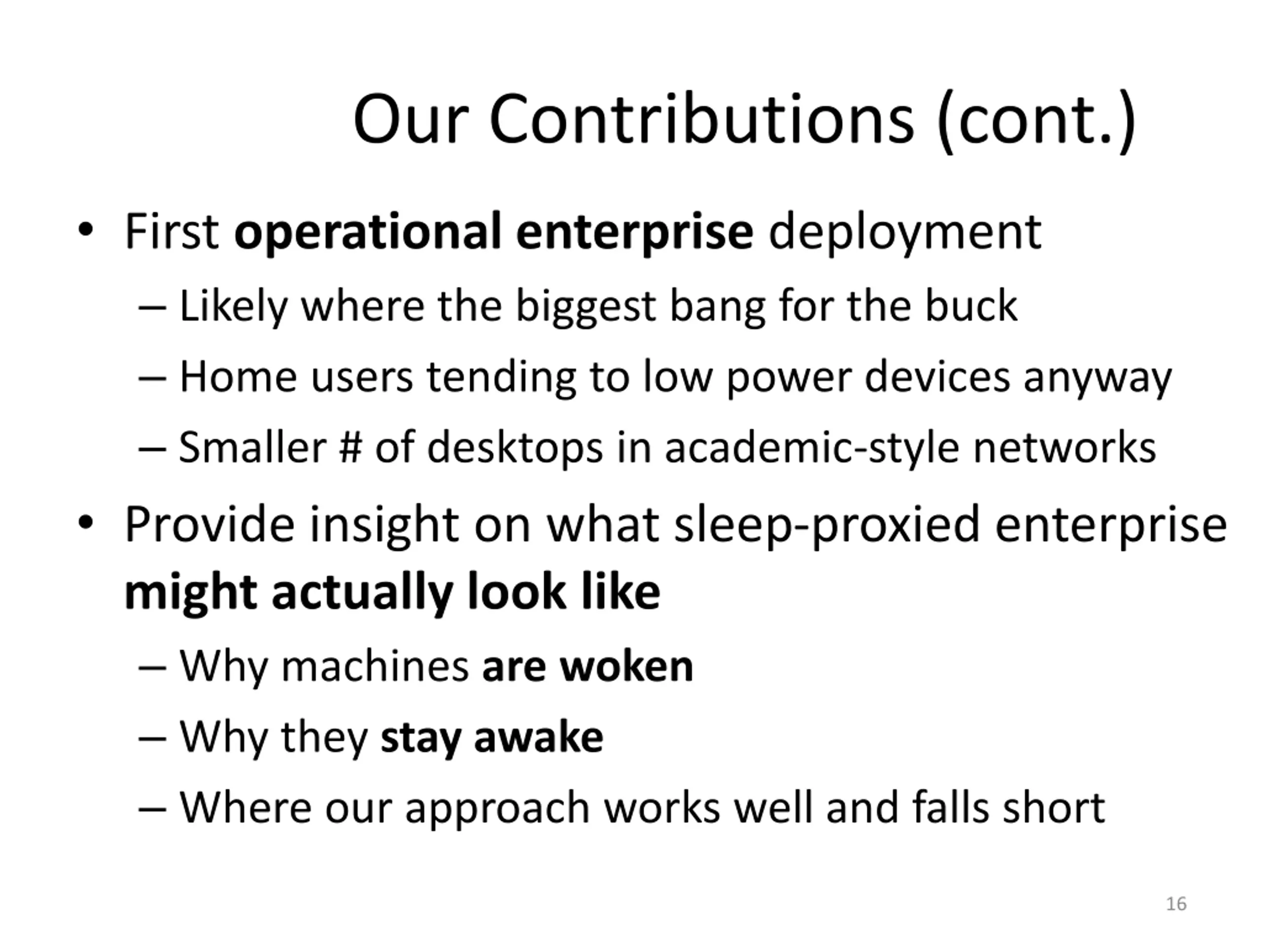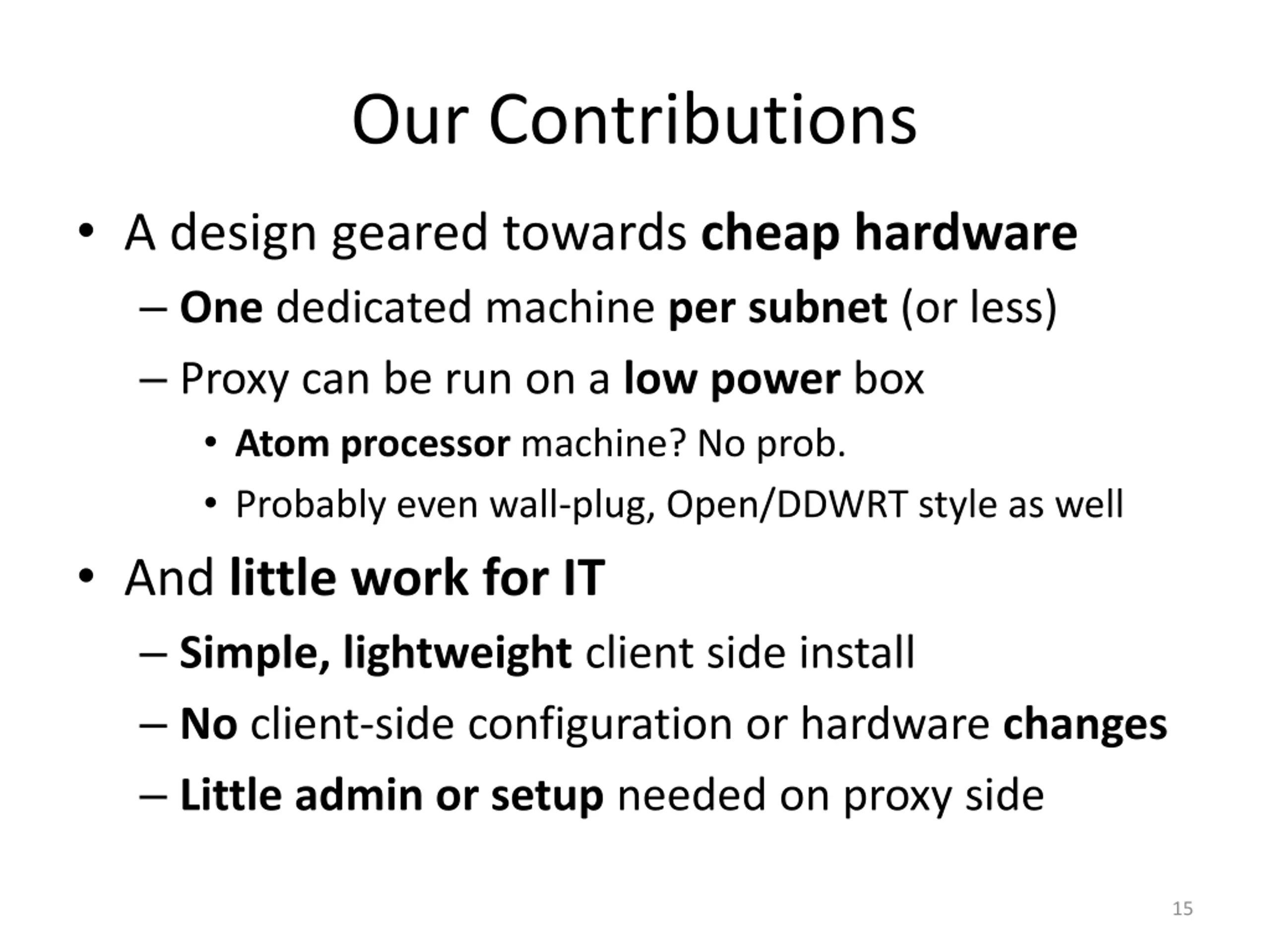 Our Contributions A design geared towards cheap hardware One dedicated machine per subnet (or less) Proxy can be run on a low power box Atom processor machine? No prob. Probably even wall-plug, Open/DDWRT style as well And little work for IT Simple, lightweight client side install No client-side configuration or hardware changes Little admin or setup needed on proxy side 15