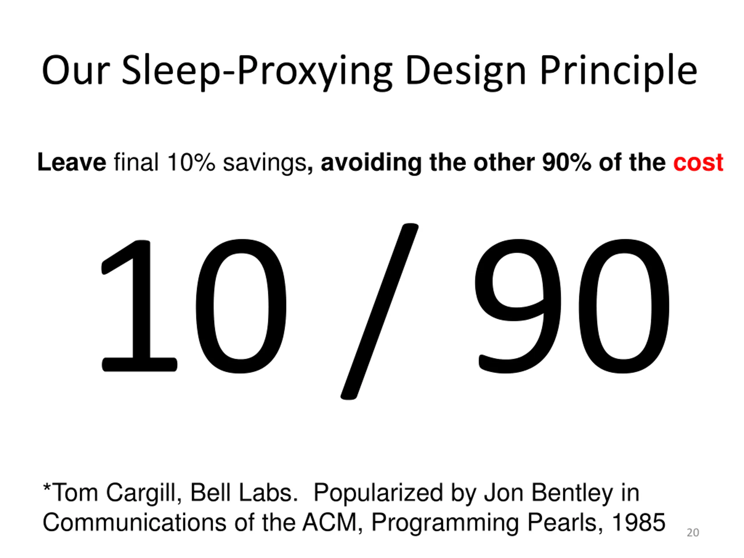 Our Sleep-Proxying Design Principle First 90% savings w/ 10% of the cost 90 / 10 *Tom Cargill, Bell Labs. Popularized by Jon Bentley in Communications of the ACM, Programming Pearls, 1985 19