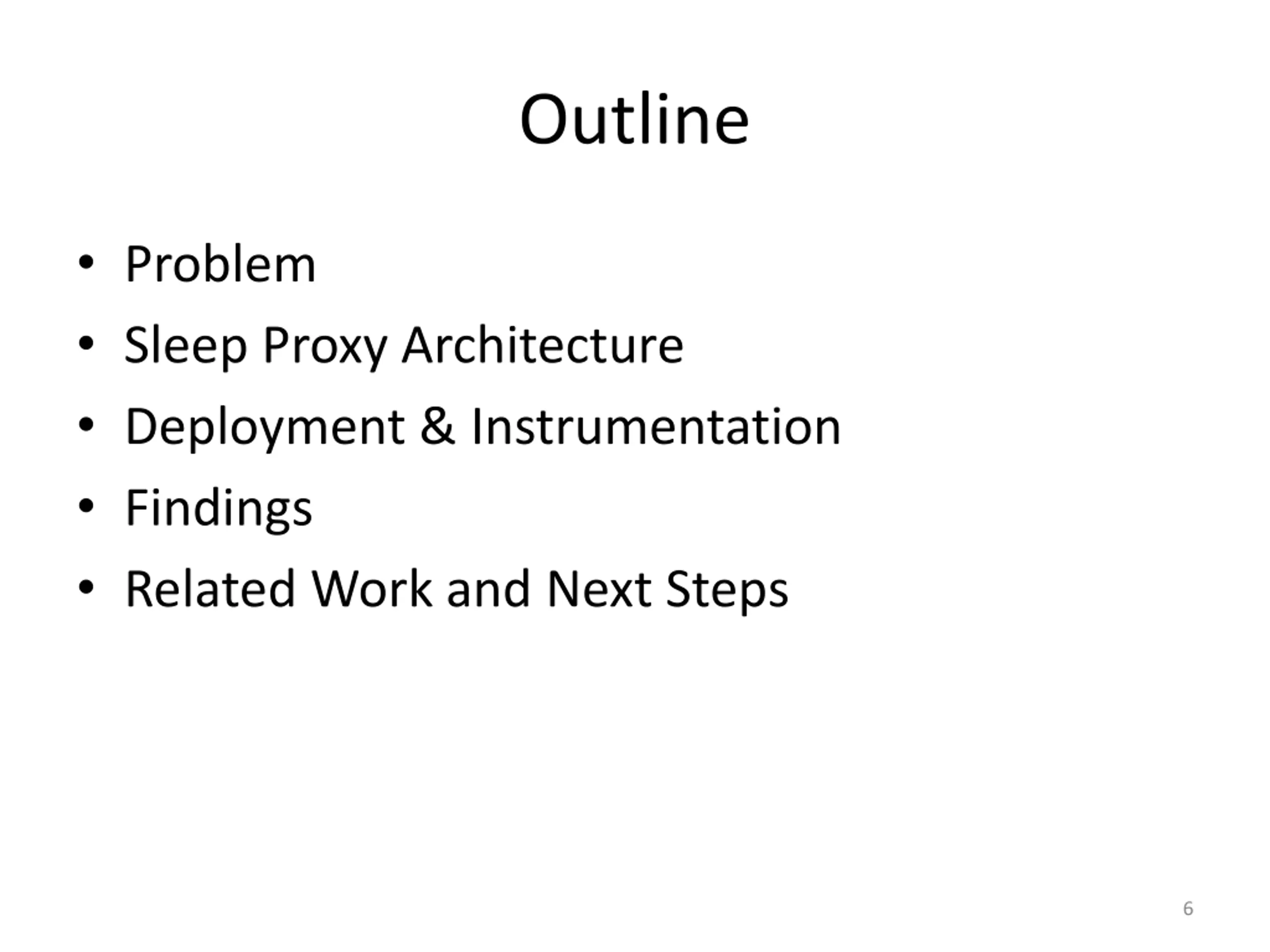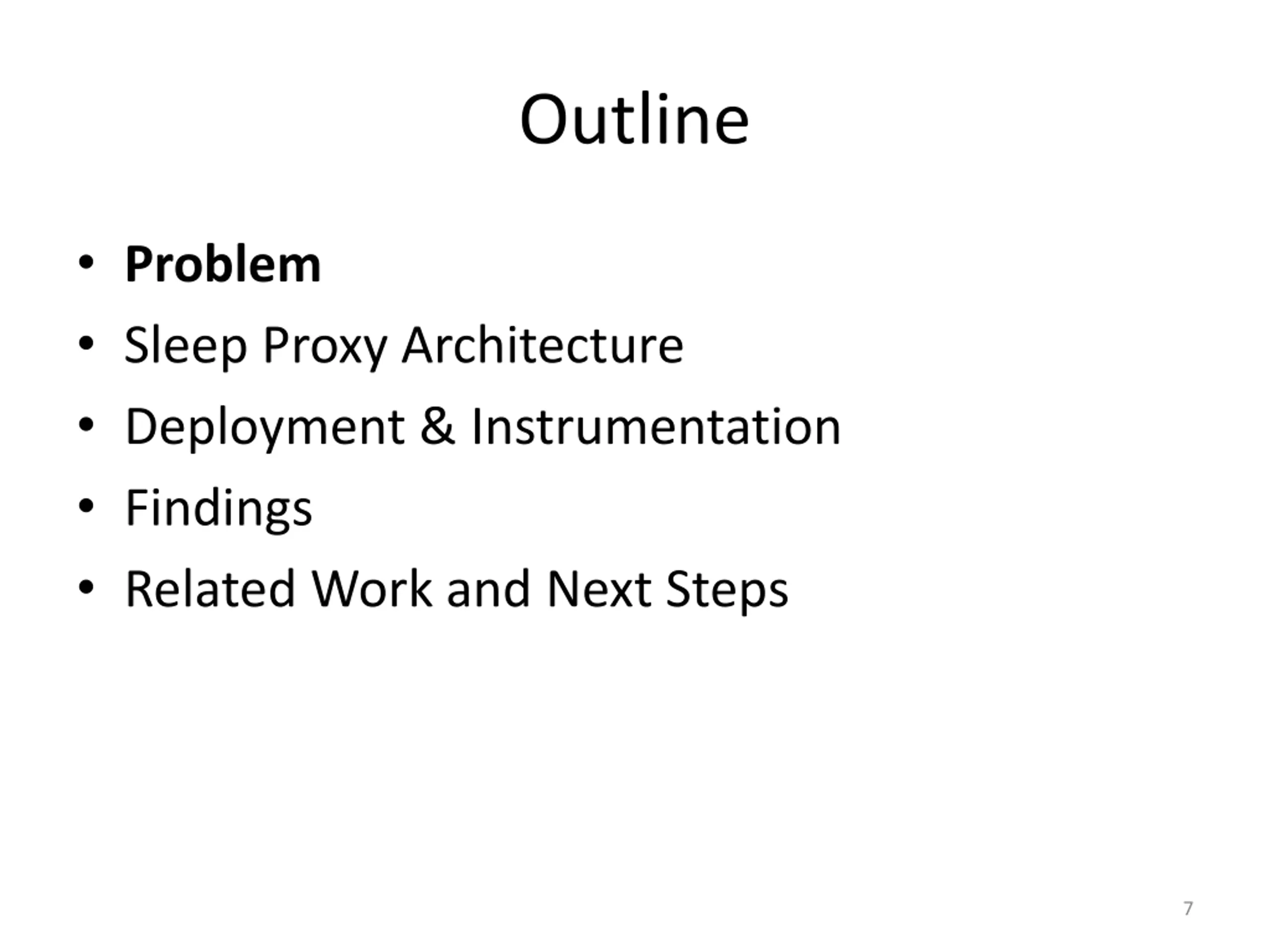 Outline Problem Sleep Proxy Architecture Deployment & Instrumentation Findings Related Work and Next Steps 6