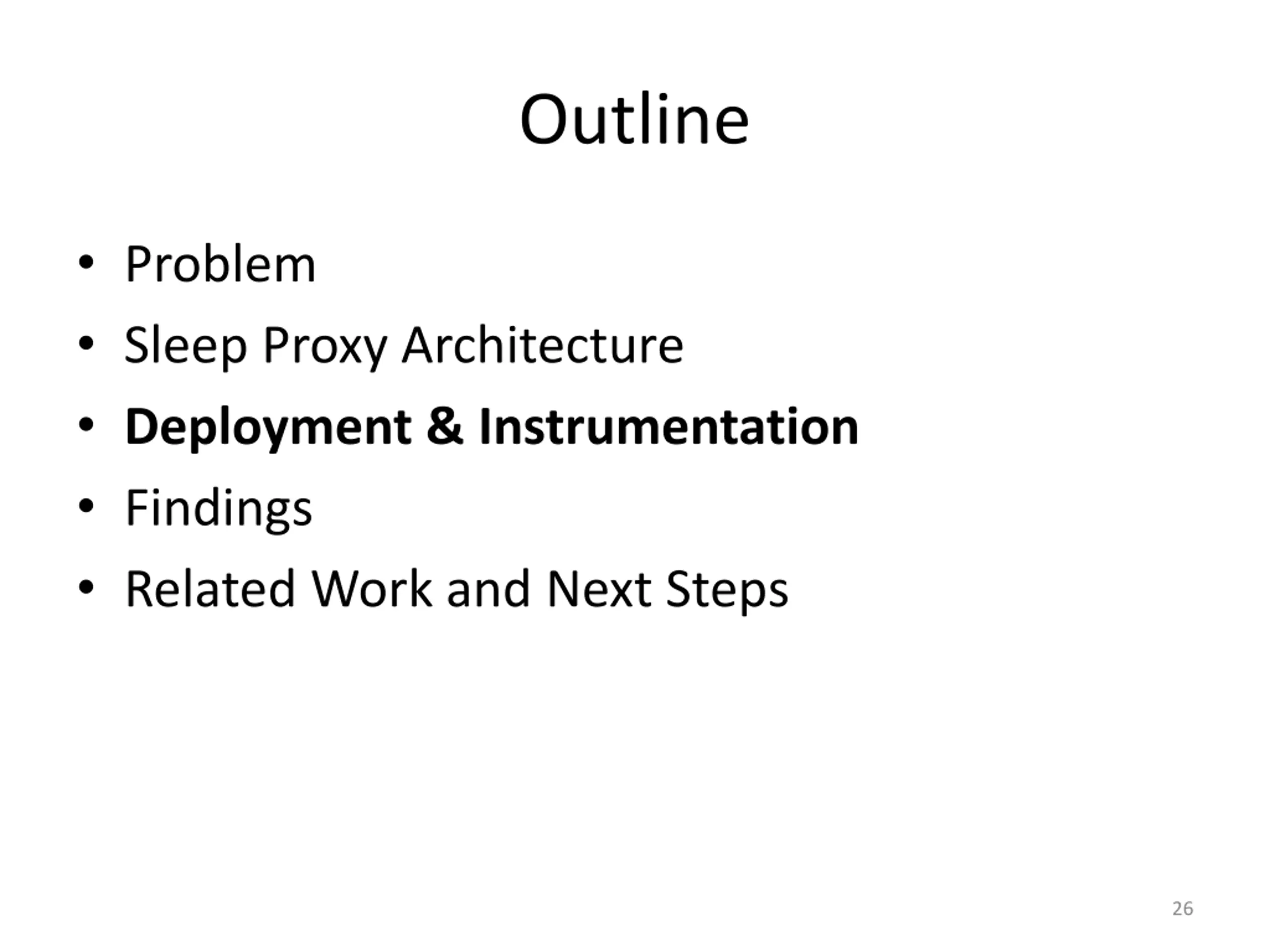 Outline Problem Sleep Proxy Architecture Deployment & Instrumentation Findings Related Work and Next Steps 26