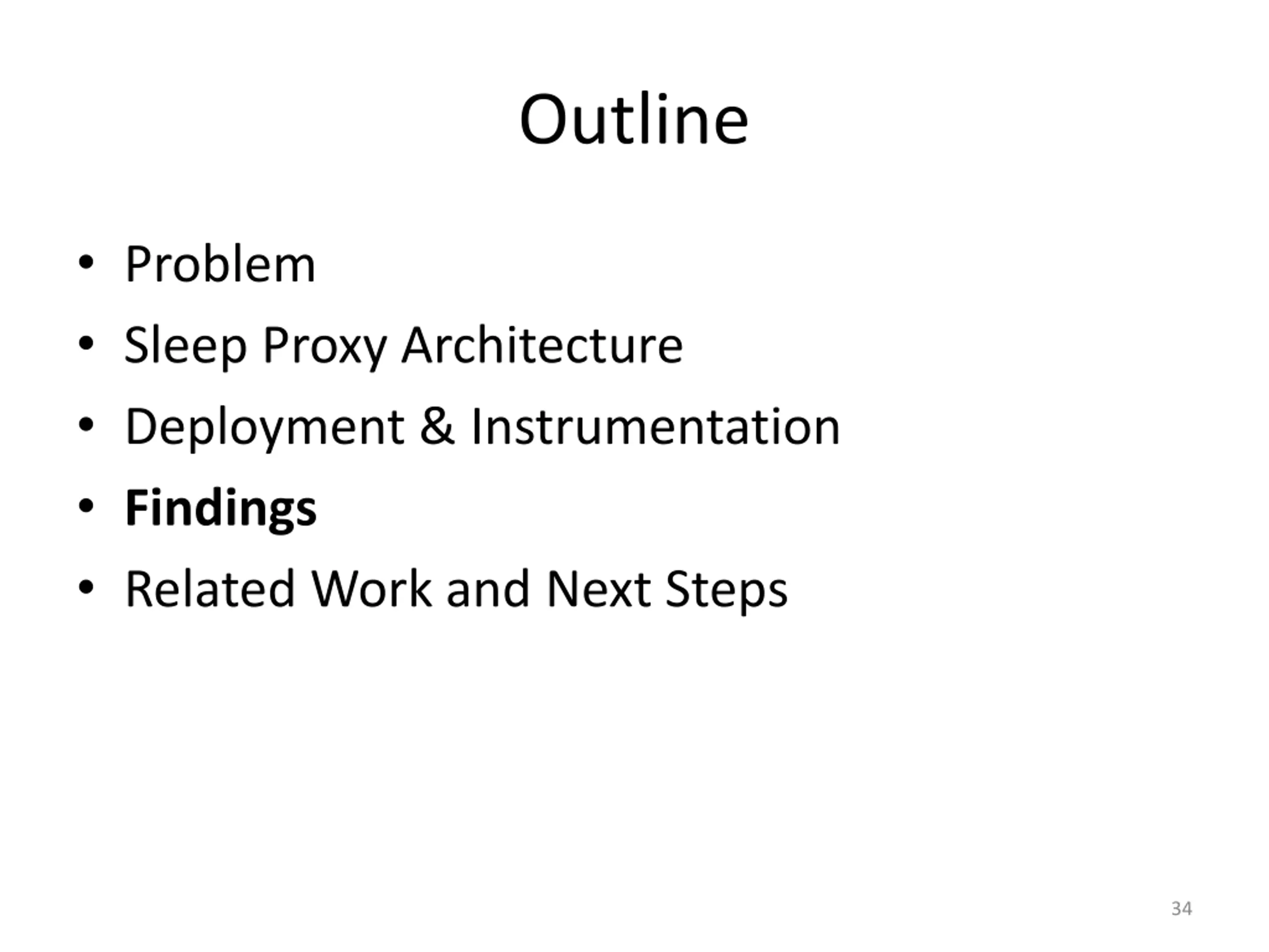 Outline Problem Sleep Proxy Architecture Deployment & Instrumentation Findings Related Work and Next Steps 34