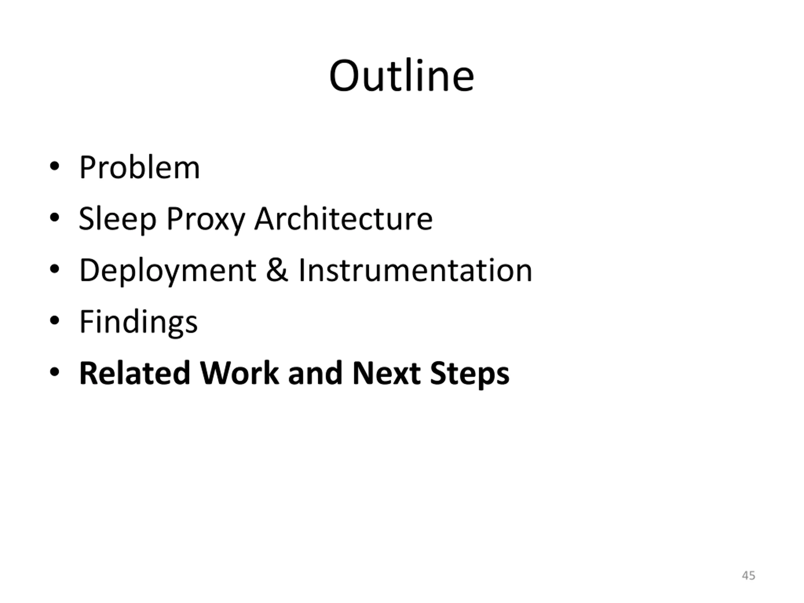 Outline Problem Sleep Proxy Architecture Deployment & Instrumentation Findings Related Work and Next Steps 45
