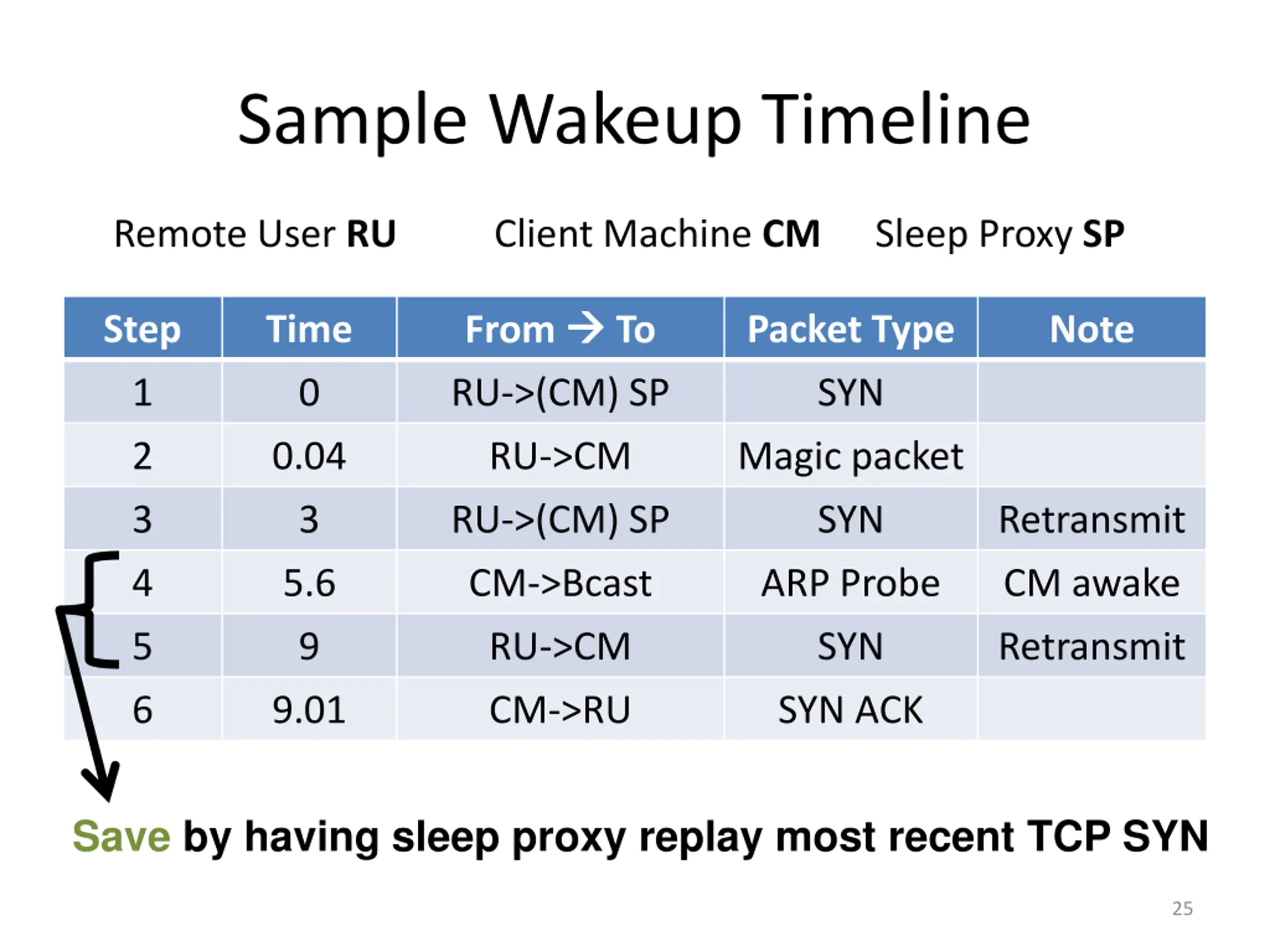 Sample Wakeup Timeline Remote User RU Client Machine CM Sleep Proxy SP From RU->(CM) SP To Step Time Packet Type Note 1 0 SYN 2 3 0.04 3 RU->CM RU->(CM) SP Magic packet SYN Retransmit 4 5.6 CM->Bcast ARP Probe CM awake 5 6 9 RU->CM CM->RU SYN Retransmit 9.01 SYN ACK Save by having sleep proxy replay most recent TCP SYN 25