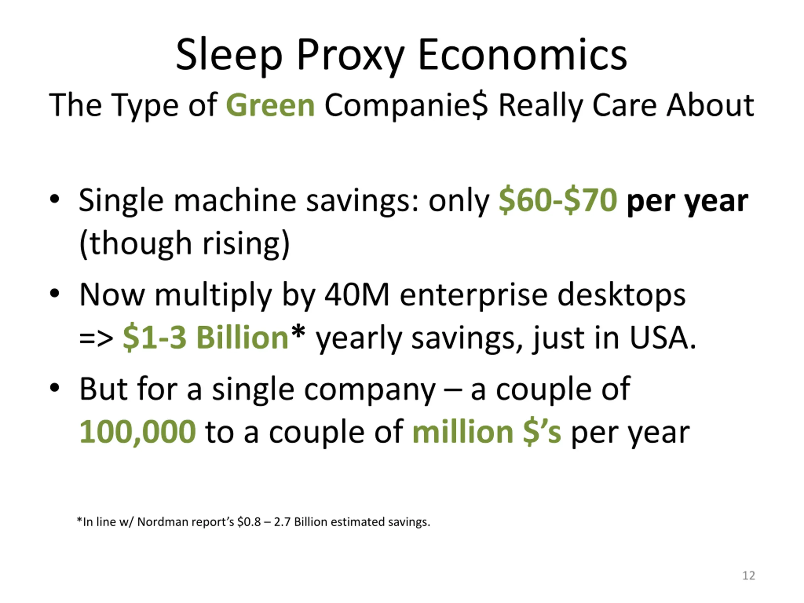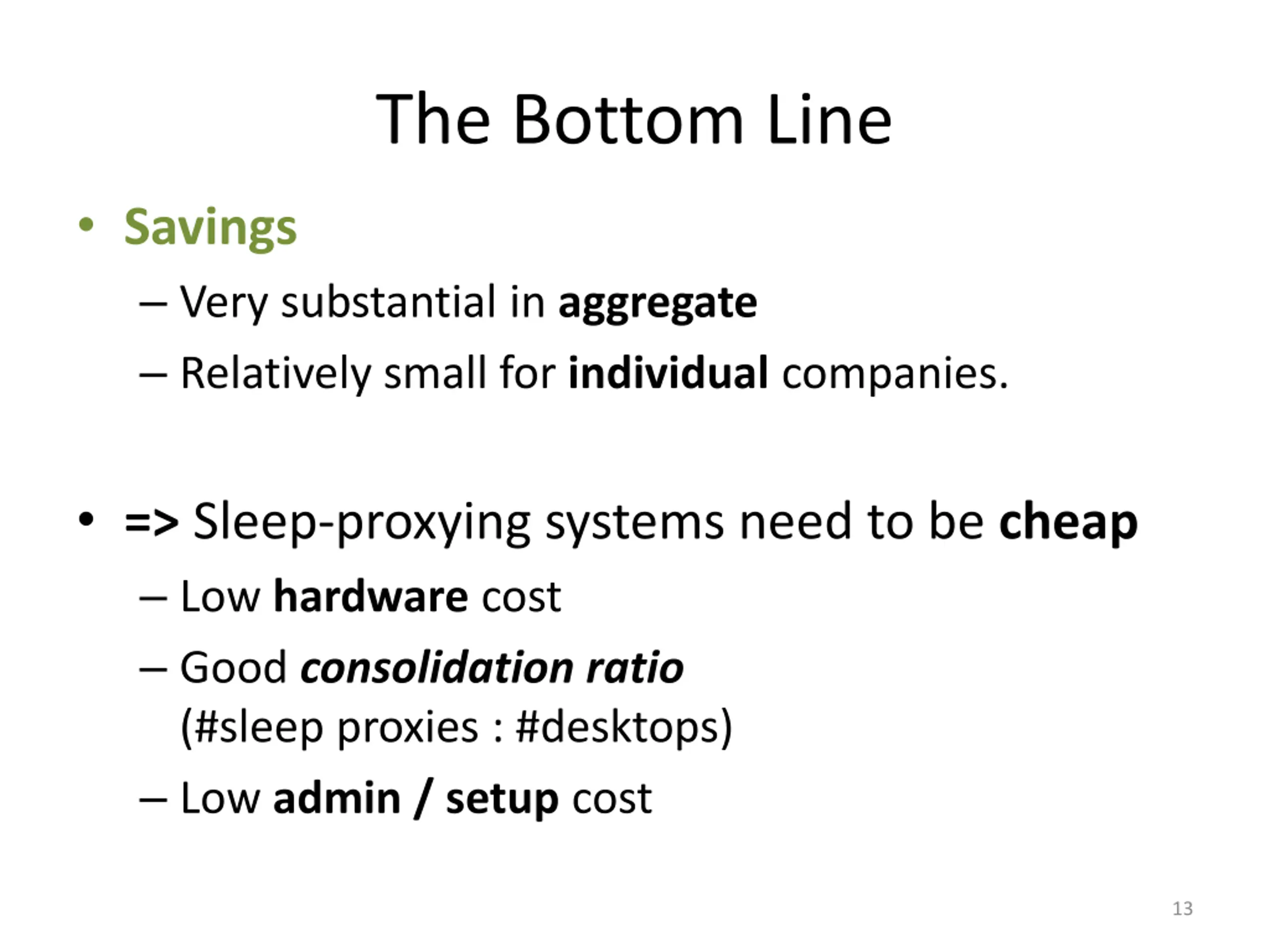 Sleep Proxy Economics The Type of Green Companie$ Really Care About Single machine savings: only $60-$70 per year (though rising) Now multiply by 40M enterprise desktops => $1-3 Billion* yearly savings, just in USA. But for a single company a couple of 100,000 to a couple of million $ s per year *In line w/ Nordman report s $0.8 2.7 Billion estimated savings. 12