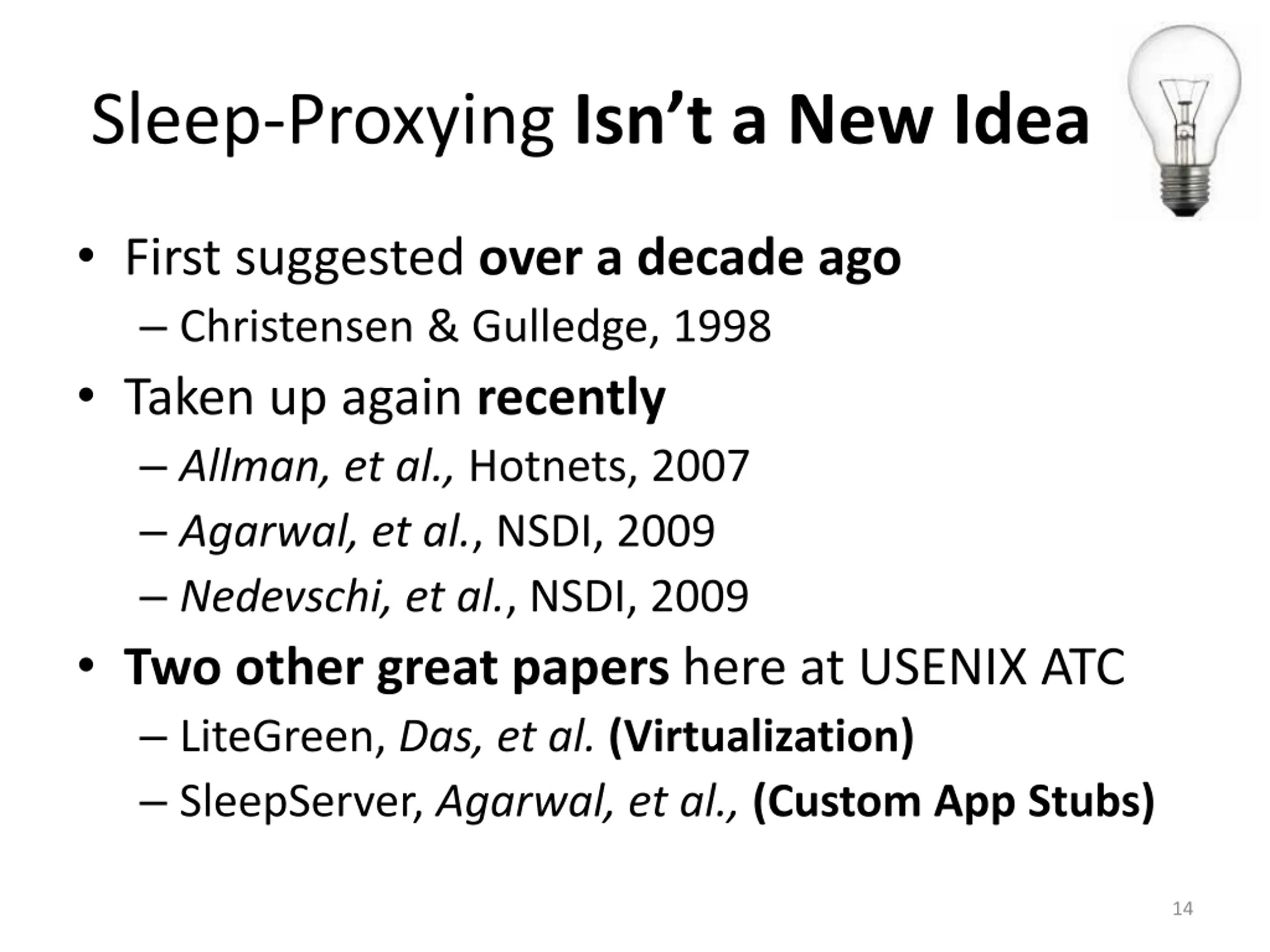 The Bottom Line Savings Very substantial in aggregate Relatively small for individual companies. => Sleep-proxying systems need to be cheap Low hardware cost Good consolidation ratio (#sleep proxies : #desktops) Low admin / setup cost 13