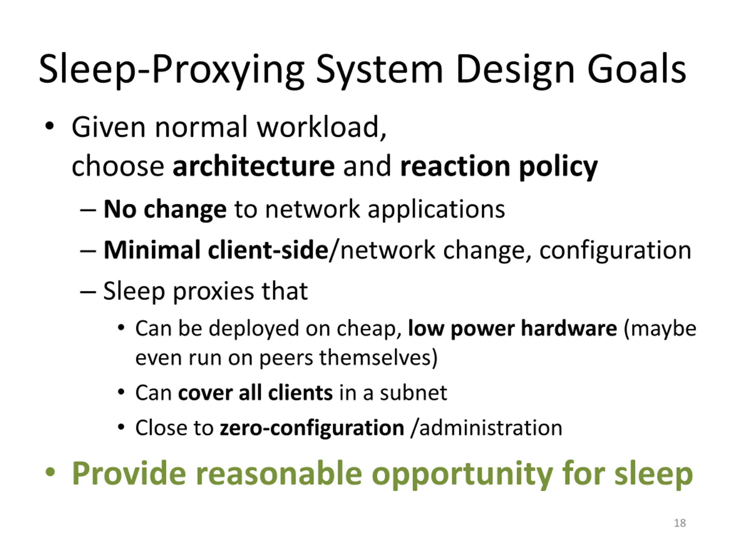 Outline Problem Sleep Proxy Architecture Deployment & Instrumentation Findings Related Work and Next Steps 17