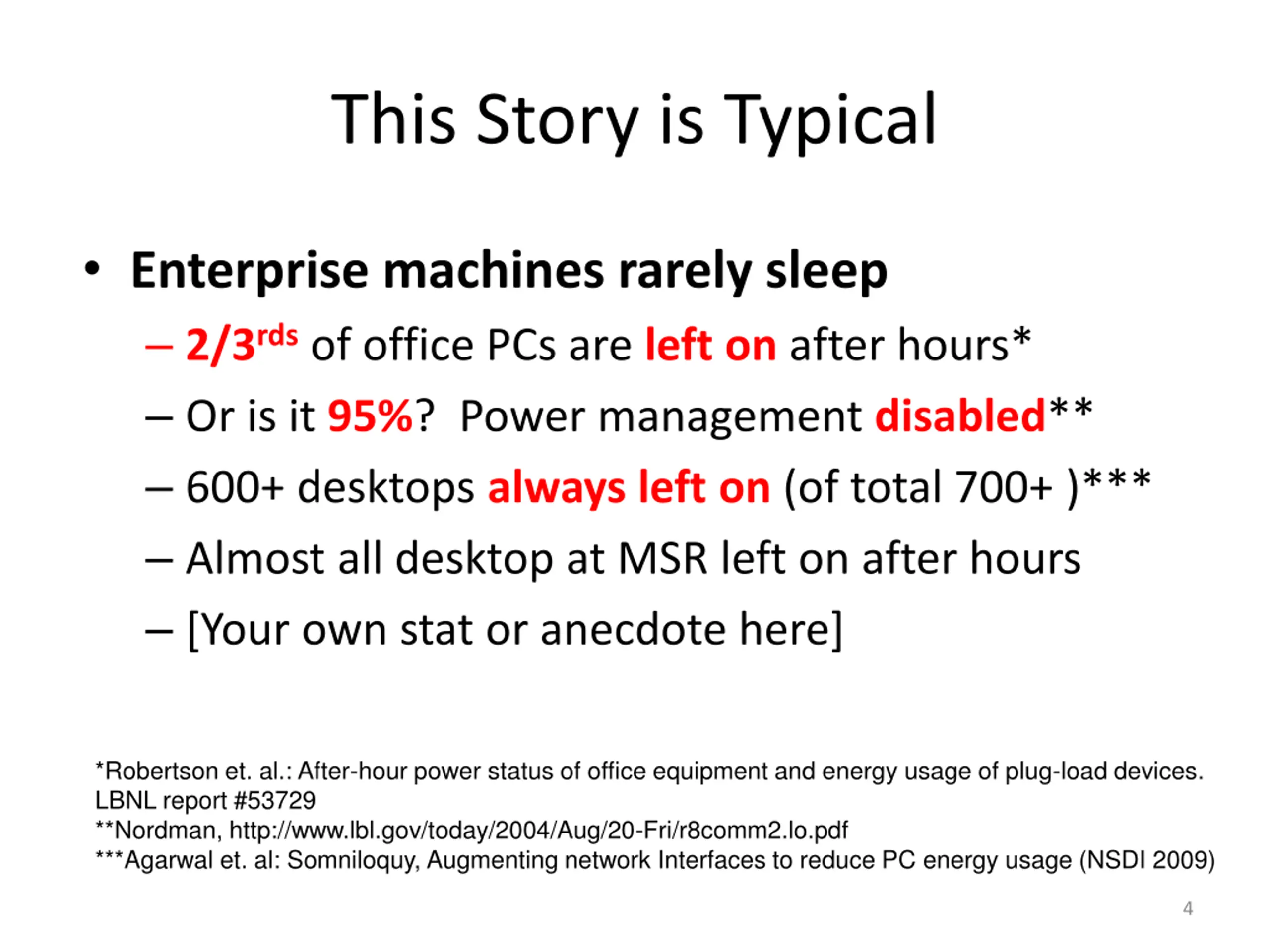 A Short Story: Sleepless in Seattle A desktop machine Workdays: often used, sometimes idle Nights, holidays, weekends: often idle sometimes accessed remotely by user more often accessed by IT (patches, updates, scans) But always powered on 2