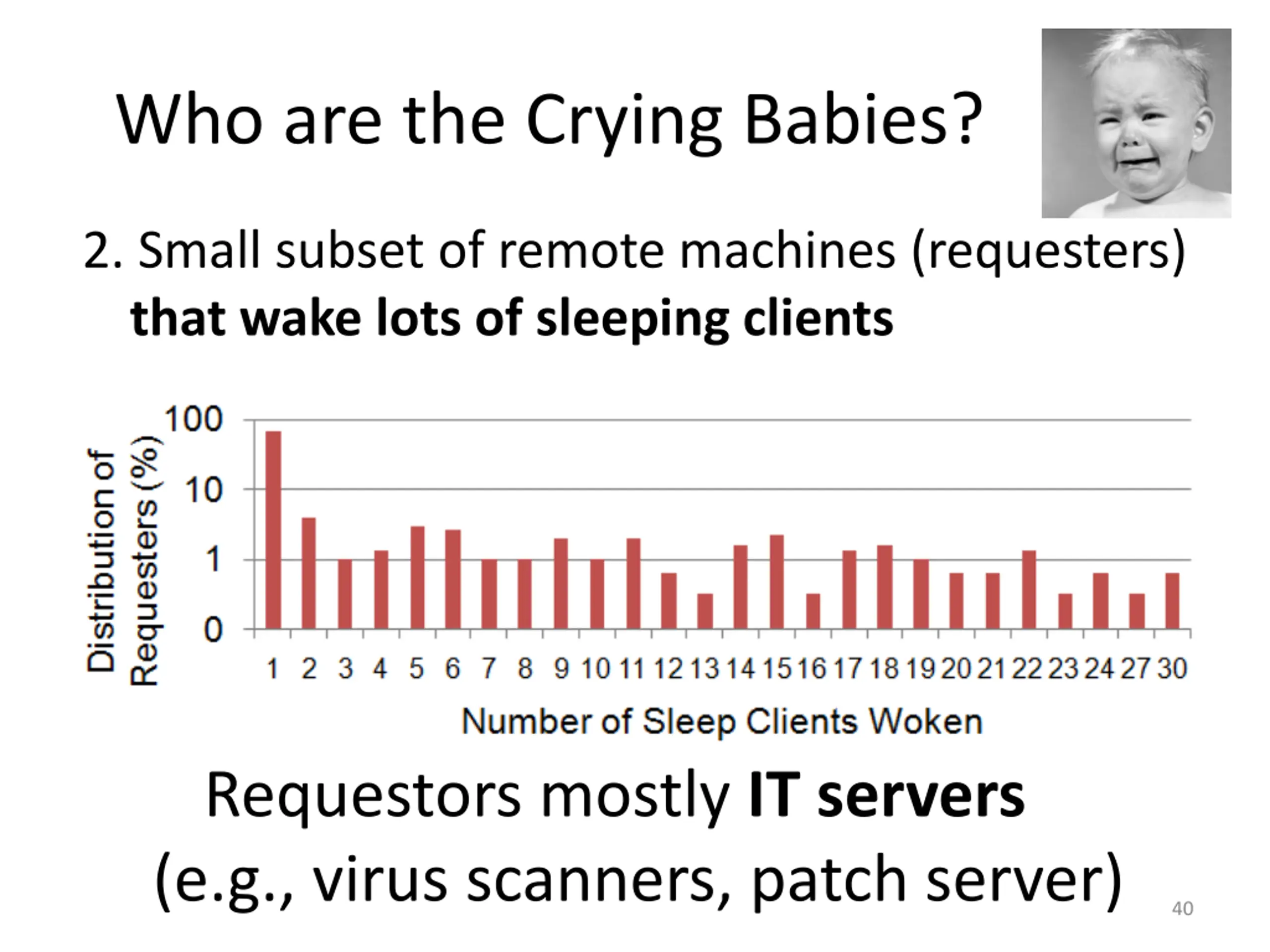 Who are the Crying Babies? 2. Small subset of remote machines (requesters) that wake lots of sleeping clients Requestors mostly IT servers (e.g., virus scanners, patch server) 40
