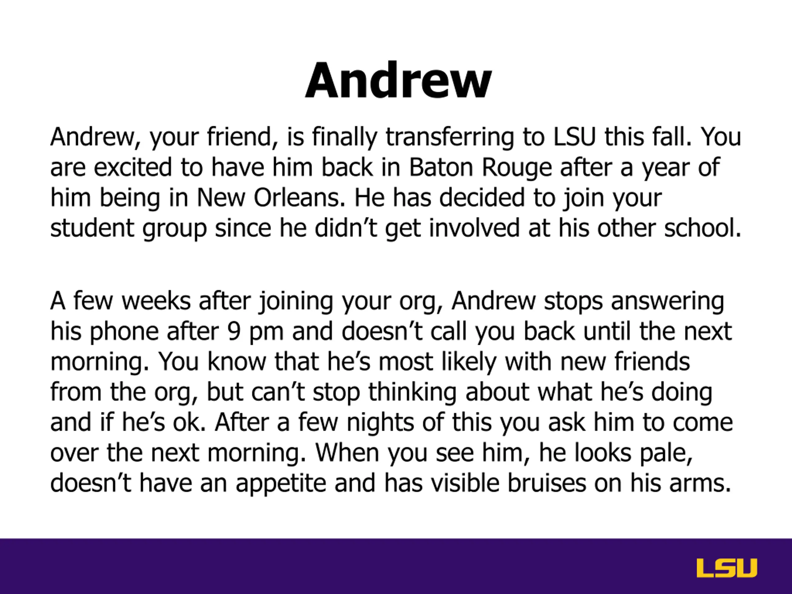 Andrew Andrew, your friend, is finally transferring to LSU this fall. You are excited to have him back in Baton Rouge after a year of him being in New Orleans. He has decided to join your student group since he didn t get involved at his other school. A few weeks after joining your org, Andrew stops answering his phone after 9 pm and doesn t call you back until the next morning. You know that he s most likely with new friends from the org, but can t stop thinking about what he s doing and if he s ok. After a few nights of this you ask him to come over the next morning. When you see him, he looks pale, doesn t have an appetite and has visible bruises on his arms.