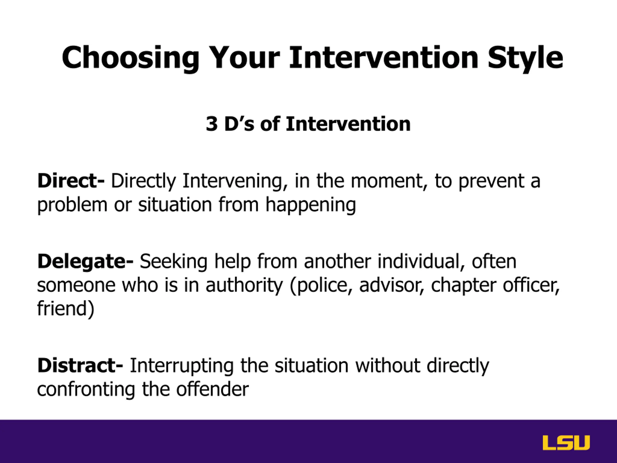Choosing Your Intervention Style 3 D s of Intervention Direct- Directly Intervening, in the moment, to prevent a problem or situation from happening Delegate- Seeking help from another individual, often someone who is in authority (police, advisor, chapter officer, friend) Distract- Interrupting the situation without directly confronting the offender