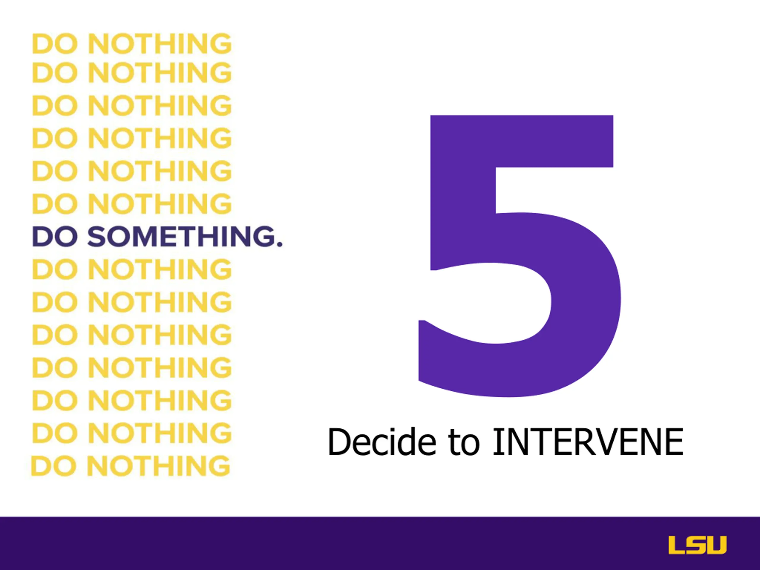 Tips for Your Different Approaches 3 D s of Intervention Direct - use language focusing on you I care, I feel, I see, I want, I will Delegate -It s never too late to delegate and submit a concern LSU Cares: lsu.edu/lsucares Distract - Think of ways to indirectly interrupt the situation by asking for help