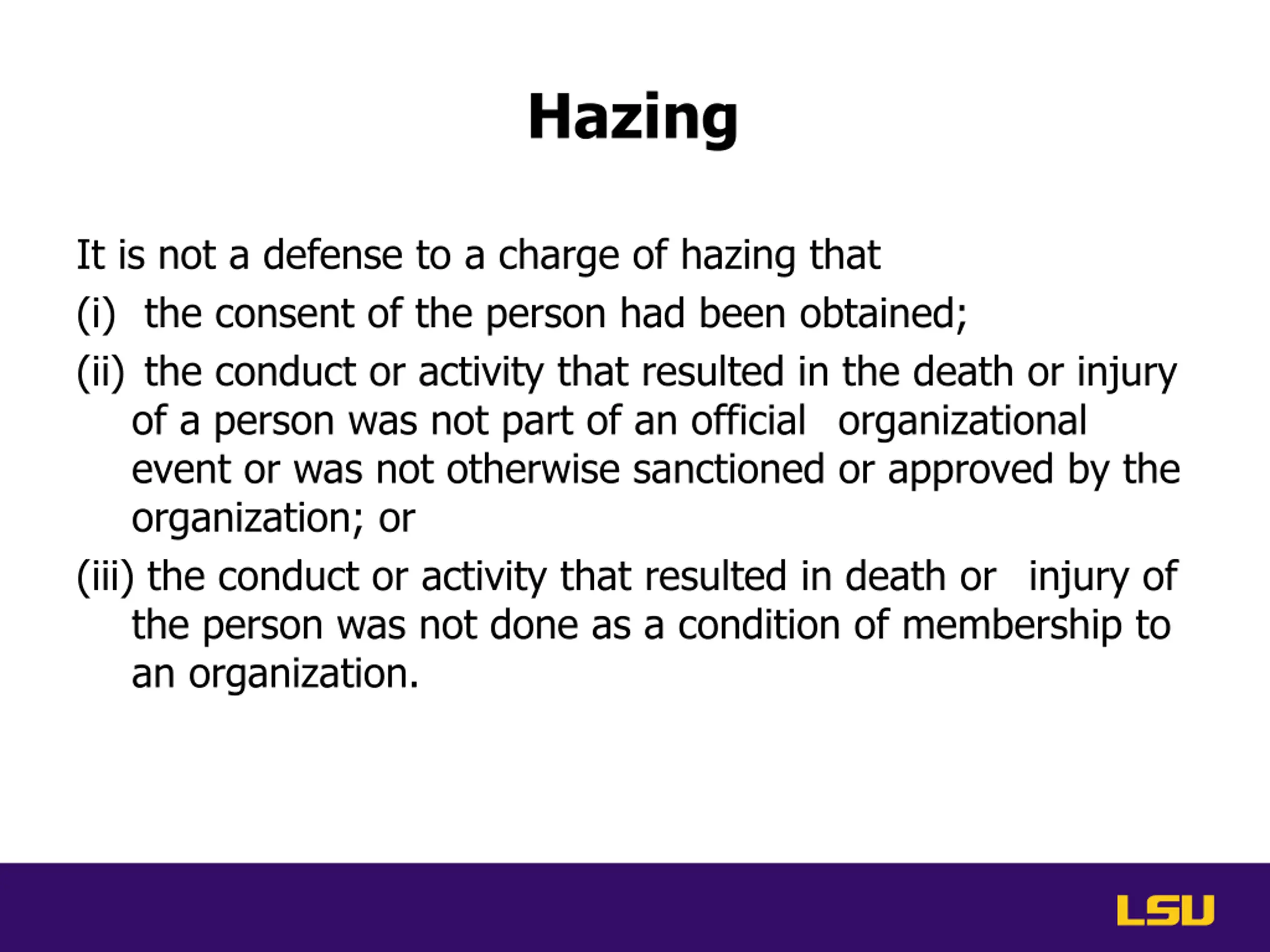 Hazing It is not a defense to a charge of hazing that (i) the consent of the person had been obtained; (ii) the conduct or activity that resulted in the death or injury of a person was not part of an official organizational event or was not otherwise sanctioned or approved by the organization; or (iii) the conduct or activity that resulted in death or injury of the person was not done as a condition of membership to an organization.