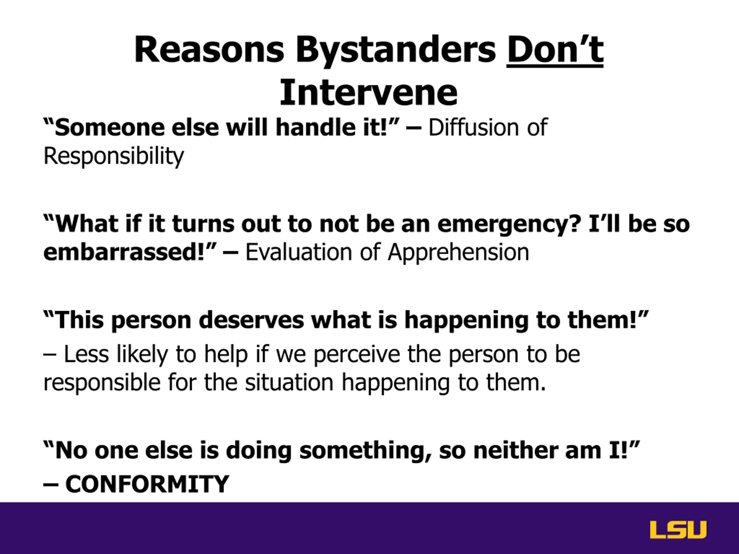 Reasons Bystanders Dont Intervene Someone else will handle it! Diffusion of Responsibility What if it turns out to not be an emergency? I ll be so embarrassed! Evaluation of Apprehension This person deserves what is happening to them! Less likely to help if we perceive the person to be responsible for the situation happening to them. No one else is doing something, so neither am I! CONFORMITY