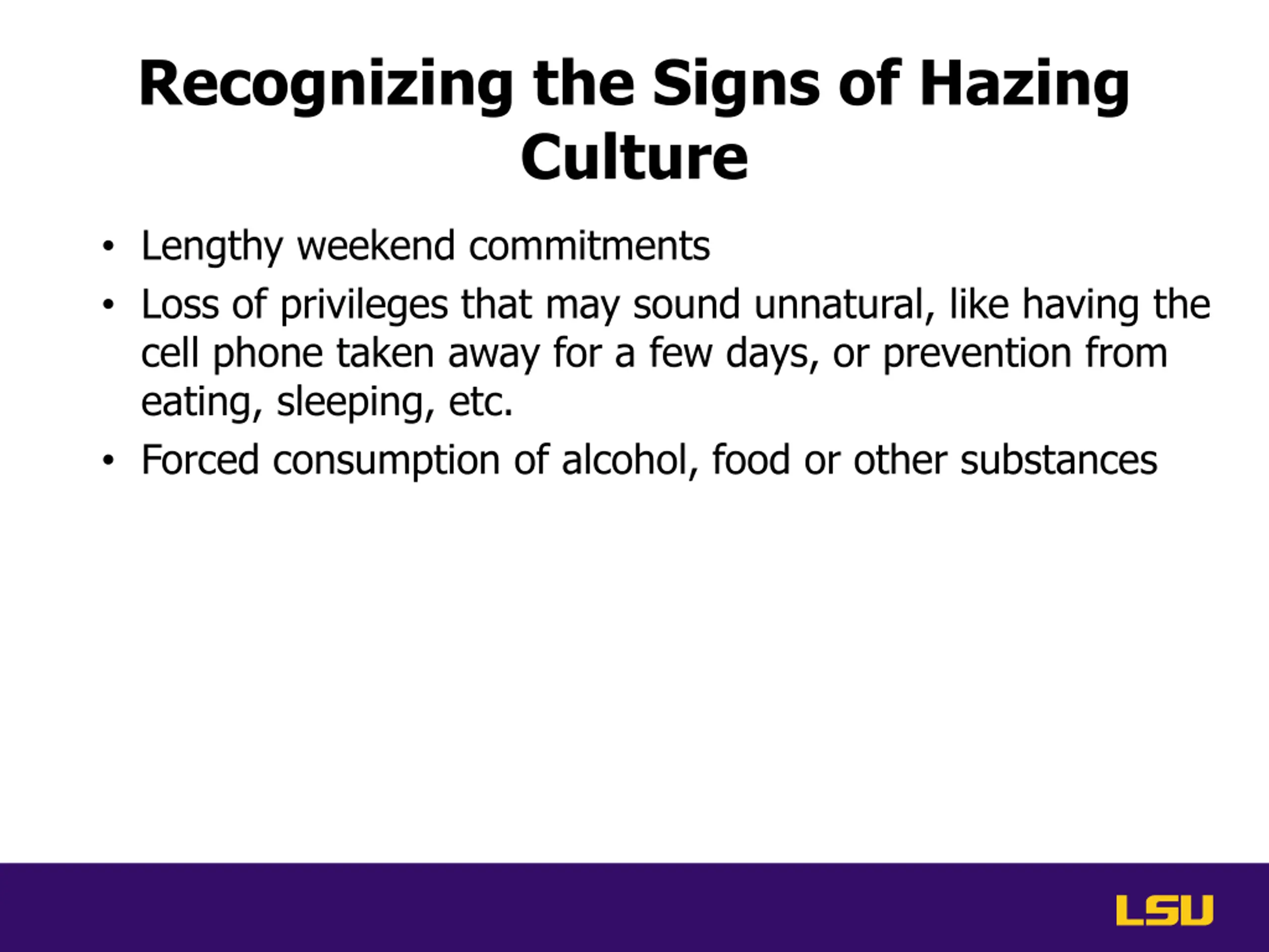 Recognizing the Signs of Hazing Culture Lengthy weekend commitments Loss of privileges that may sound unnatural, like having the cell phone taken away for a few days, or prevention from eating, sleeping, etc. Forced consumption of alcohol, food or other substances