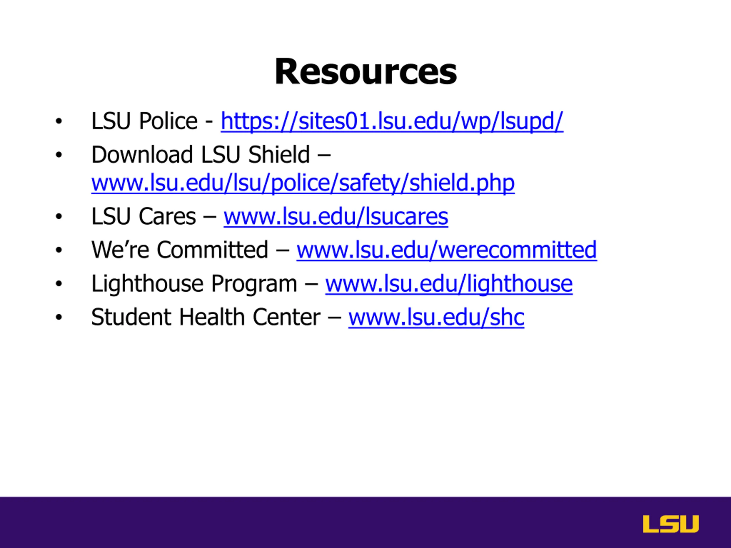 Resources LSU Police - https://sites01.lsu.edu/wp/lsupd/ Download LSU Shield www.lsu.edu/lsu/police/safety/shield.php LSU Cares www.lsu.edu/lsucares We re Committed www.lsu.edu/werecommitted Lighthouse Program www.lsu.edu/lighthouse Student Health Center www.lsu.edu/shc