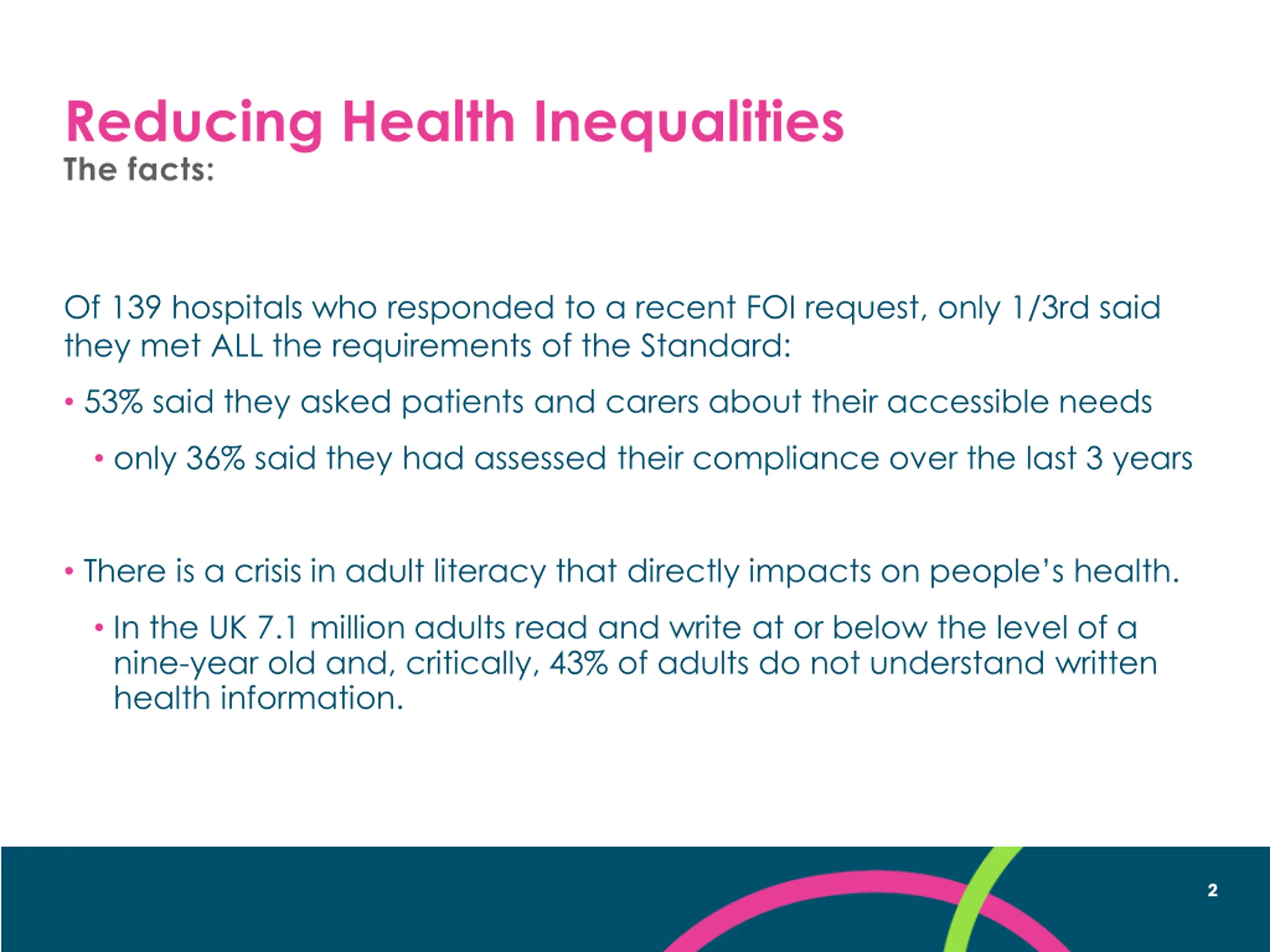 Reducing Health Inequalities The facts: Of 139 hospitals who responded to a recent FOI request, only 1/3rd said they met ALL the requirements of the Standard: 53% said they asked patients and carers about their accessible needs only 36% said they had assessed their compliance over the last 3 years There is a crisis in adult literacy that directly impacts on people s health. In the UK 7.1 million adults read and write at or below the level of a nine-year old and, critically, 43% of adults do not understand written health information. 2