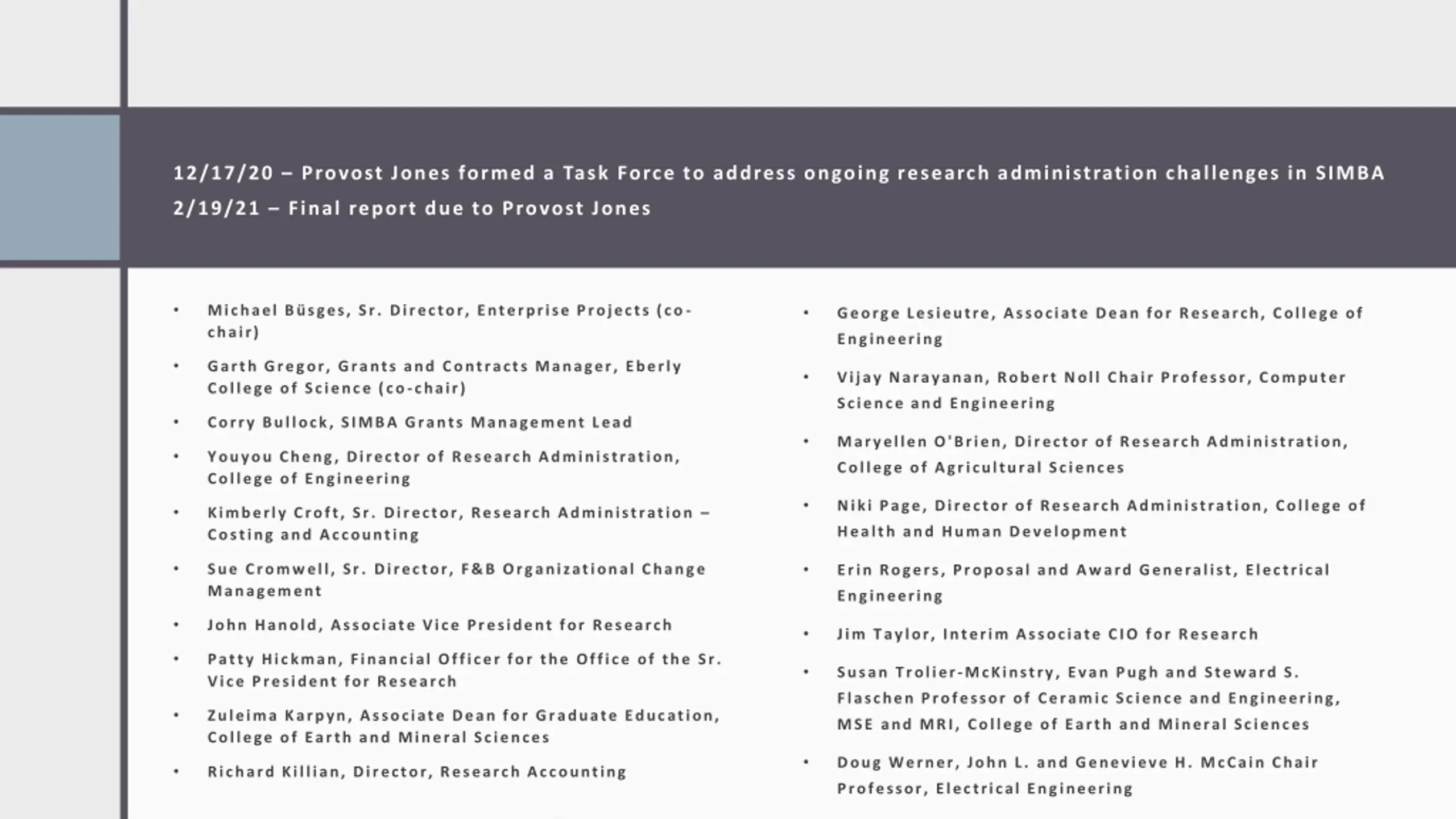 12/17/20 Provost Jones formed a Task Force to address ongoing research administration challenges in SIMBA 2/19/21 Final report due to Provost Jones Michael B sges, Sr. Director, Enterprise Projects (co- chair) George Lesieutre, Associate Dean for Research, College of Engineering Garth Gregor, Grants and Contracts Manager, Eberly College of Science (co-chair) Vijay Narayanan, Robert Noll Chair Professor, Computer Science and Engineering Corry Bullock, SIMBA Grants Management Lead Maryellen O'Brien, Director of Research Administration, Youyou Cheng, Director of Research Administration, College of Engineering College of Agricultural Sciences Niki Page, Director of Research Administration, College of Kimberly Croft, Sr. Director, Research Administration Costing and Accounting Health and Human Development Sue Cromwell, Sr. Director, F&B Organizational Change Management Erin Rogers, Proposal and Award Generalist, Electrical Engineering John Hanold, Associate Vice President for Research Jim Taylor, Interim Associate CIO for Research Patty Hickman, Financial Officer for the Office of the Sr. Vice President for Research Susan Trolier-McKinstry, Evan Pugh and Steward S. Flaschen Professor of Ceramic Science and Engineering, Zuleima Karpyn, Associate Dean for Graduate Education, College of Earth and Mineral Sciences MSE and MRI, College of Earth and Mineral Sciences Doug Werner, John L. and Genevieve H. McCain Chair Richard Killian, Director, Research Accounting Professor, Electrical Engineering