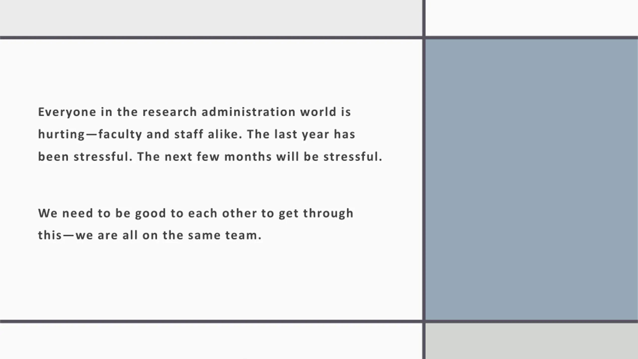 Everyone in the research administration world is hurting faculty and staff alike. The last year has been stressful. The next few months will be stressful. We need to be good to each other to get through this we are all on the same team.