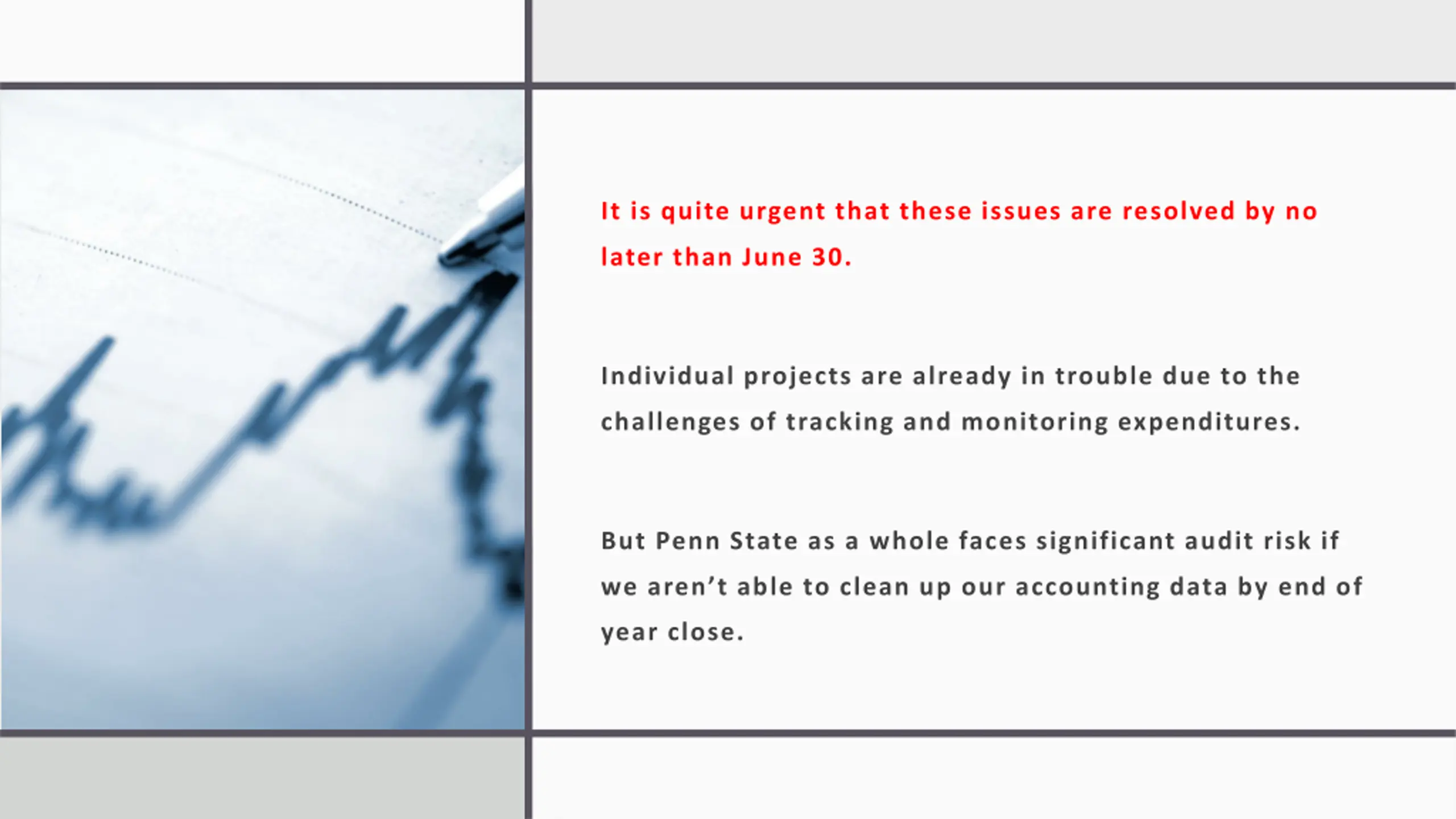 It is quite urgent that these issues are resolved by no later than June 30. Individual projects are already in trouble due to the challenges of tracking and monitoring expenditures. But Penn State as a whole faces significant audit risk if we aren t able to clean up our accounting data by end of year close.