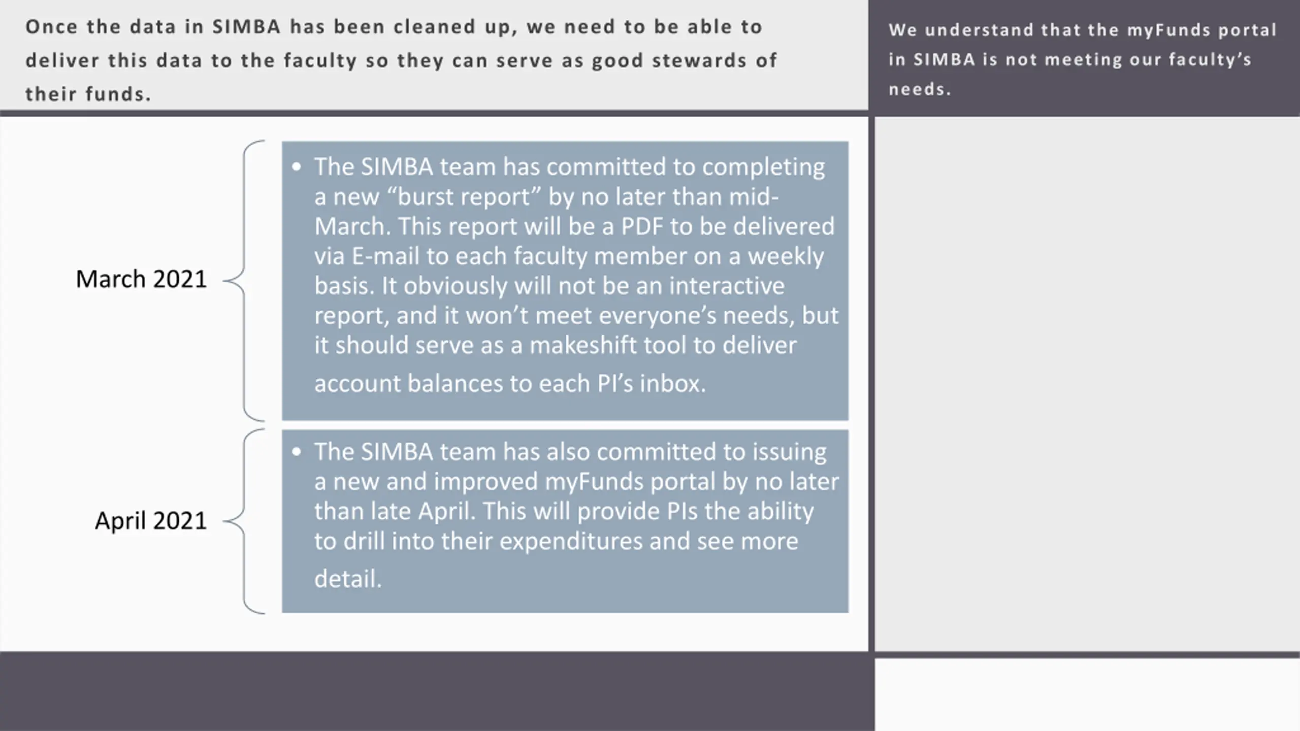 Once the data in SIMBA has been cleaned up, we need to be able to We understand that the myFunds portal deliver this data to the faculty so they can serve as good stewards of in SIMBA is not meeting our faculty s needs. their funds. The SIMBA team has committed to completing a new burst report by no later than mid- March. This report will be a PDF to be delivered via E-mail to each faculty member on a weekly basis. It obviously will not be an interactive report, and it won t meet everyone s needs, but it should serve as a makeshift tool to deliver account balances to each PI s inbox. March 2021 The SIMBA team has also committed to issuing a new and improved myFunds portal by no later than late April. This will provide PIs the ability to drill into their expenditures and see more detail. April 2021