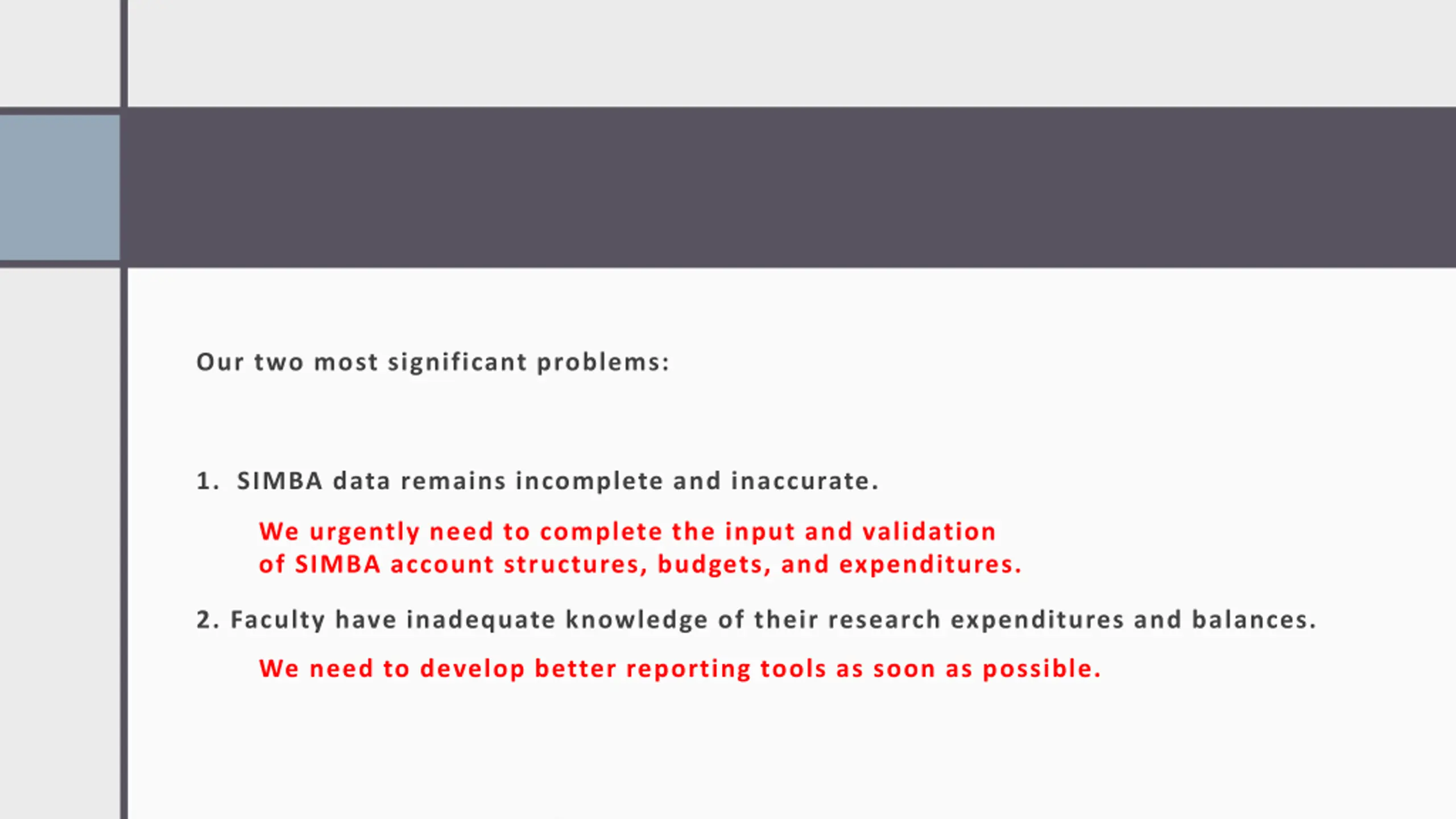 Our two most significant problems: 1. SIMBA data remains incomplete and inaccurate. We urgently need to complete the input and validation of SIMBA account structures, budgets, and expenditures. 2. Faculty have inadequate knowledge of their research expenditures and balances. We need to develop better reporting tools as soon as possible.