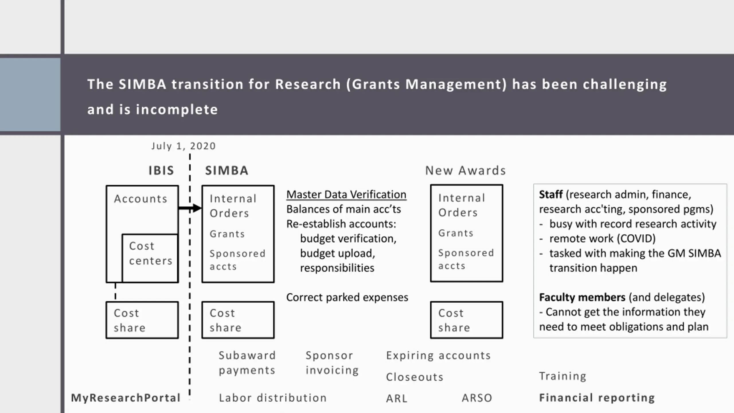 The SIMBA transition for Research (Grants Management) has been challenging and is incomplete July 1, 2020 IBIS SIMBA New Awards Master Data Verification Balances of main acc ts Re-establish accounts: budget verification, budget upload, responsibilities Staff (research admin, finance, research acc'ting, sponsored pgms) - busy with record research activity - remote work (COVID) - tasked with making the GM SIMBA transition happen Internal Orders Internal Orders Accounts Grants Grants Cost centers Sponsored accts Sponsored accts Correct parked expenses Faculty members (and delegates) - Cannot get the information they need to meet obligations and plan Cost share Cost share Cost share Subaward payments Sponsor invoicing Expiring accounts Training Closeouts Financial reporting MyResearchPortal Labor distribution ARSO ARL
