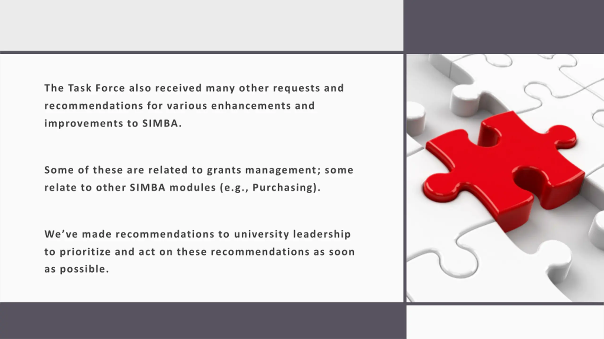 The Task Force also received many other requests and recommendations for various enhancements and improvements to SIMBA. Some of these are related to grants management; some relate to other SIMBA modules (e.g., Purchasing). We ve made recommendations to university leadership to prioritize and act on these recommendations as soon as possible.