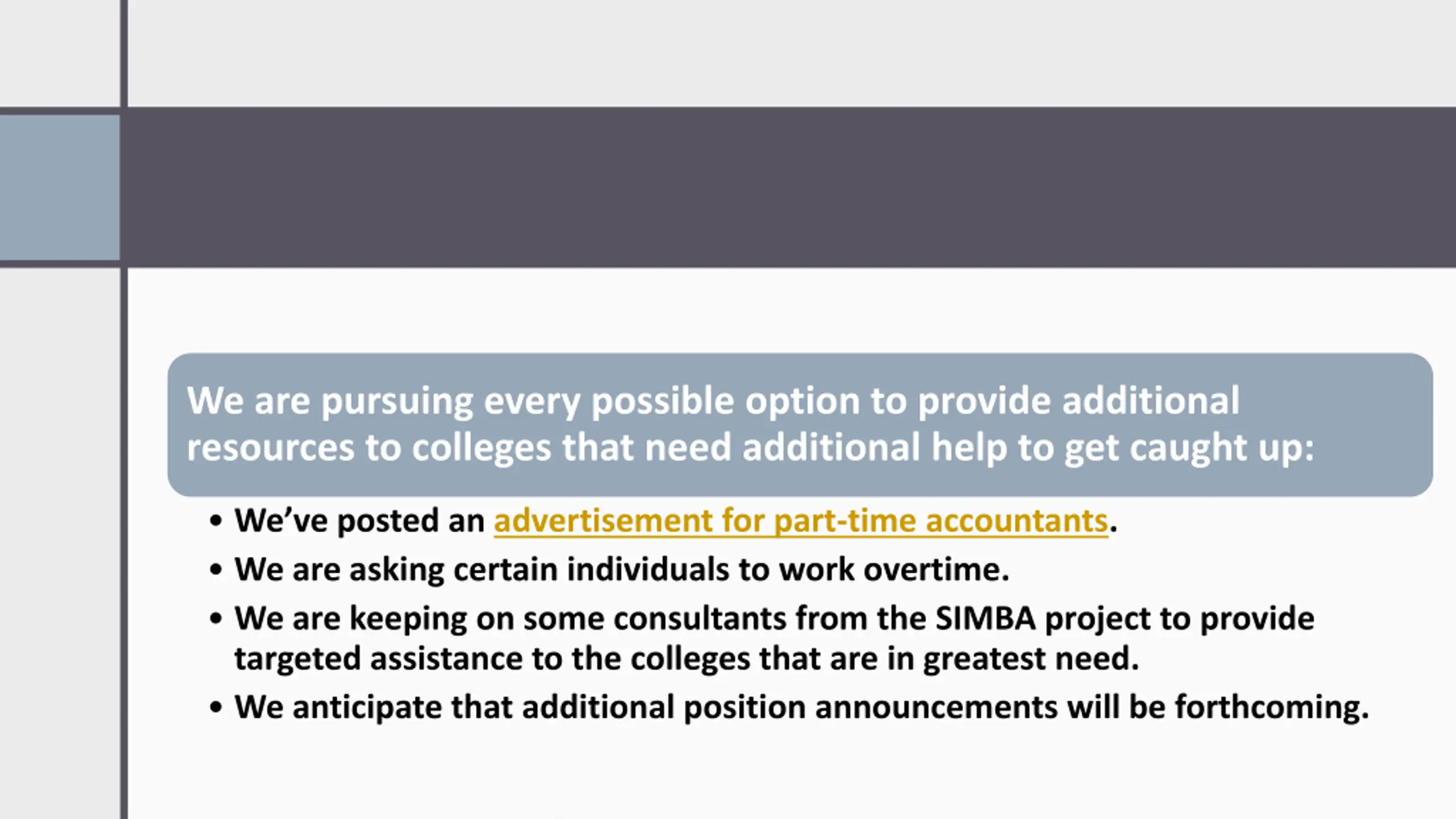 We are pursuing every possible option to provide additional resources to colleges that need additional help to get caught up: advertisement for part-time accountants We ve posted an advertisement for part-time accountants. We are asking certain individuals to work overtime. We are keeping on some consultants from the SIMBA project to provide targeted assistance to the colleges that are in greatest need. We anticipate that additional position announcements will be forthcoming.