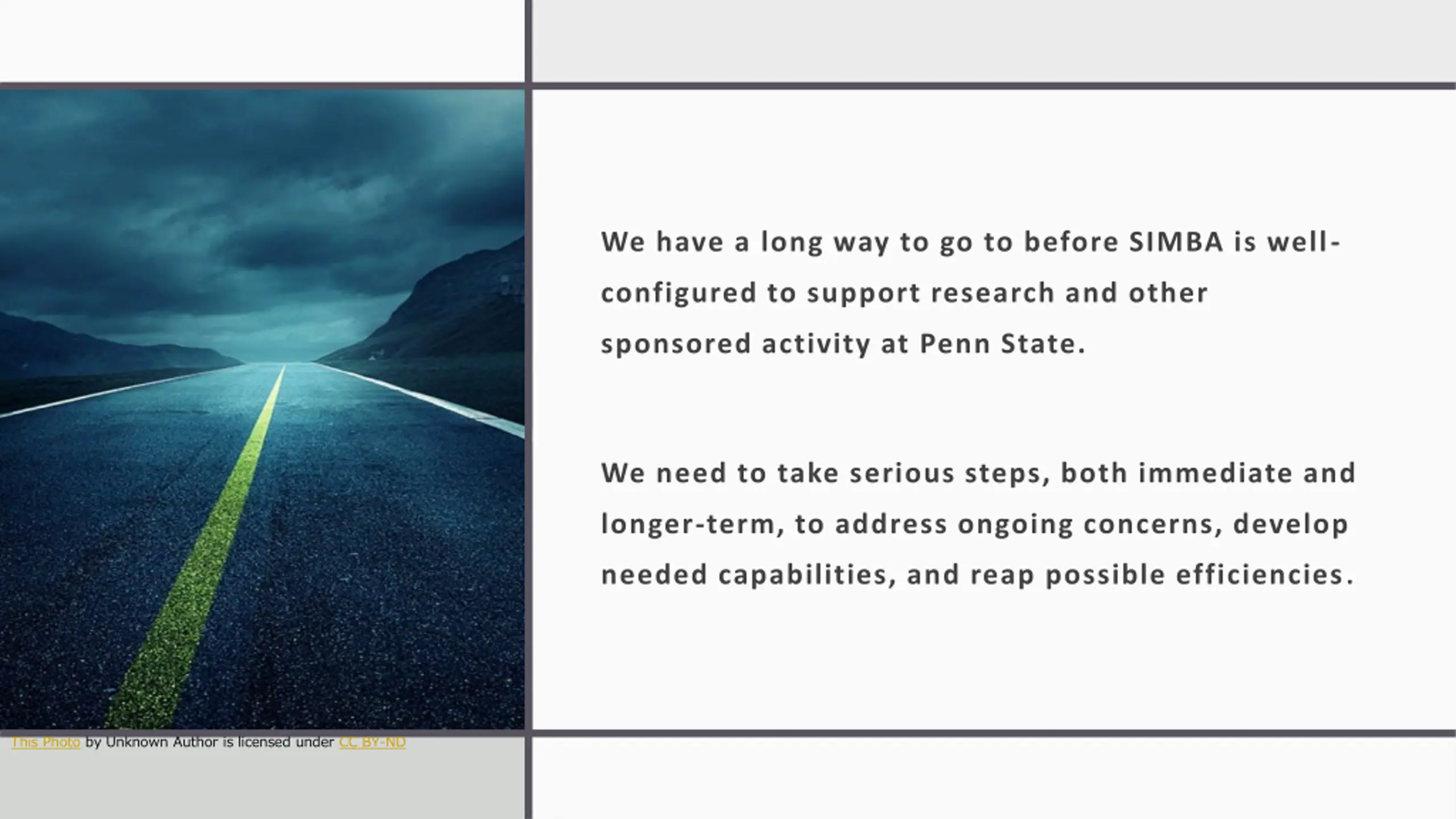 We have a long way to go to before SIMBA is well- configured to support research and other sponsored activity at Penn State. We need to take serious steps, both immediate and longer-term, to address ongoing concerns, develop needed capabilities, and reap possible efficiencies. This Photo by Unknown Author is licensed under CC BY-ND