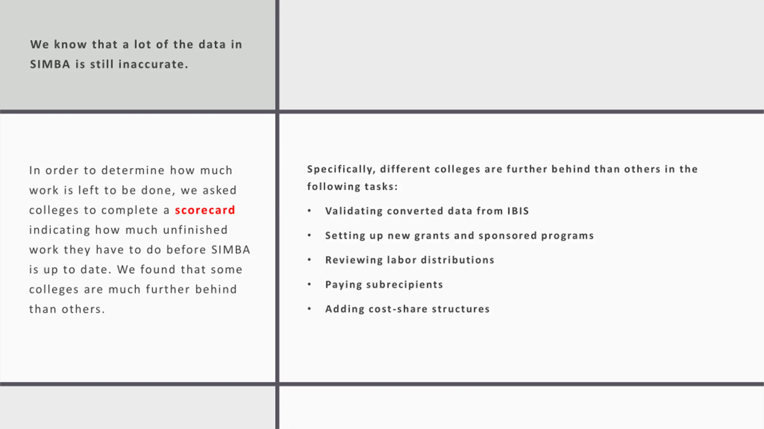 We know that a lot of the data in SIMBA is still inaccurate. Specifically, different colleges are further behind than others in the In order to determine how much following tasks: work is left to be done, we asked colleges to complete a scorecard Validating converted data from IBIS indicating how much unfinished Setting up new grants and sponsored programs work they have to do before SIMBA Reviewing labor distributions is up to date. We found that some Paying subrecipients colleges are much further behind than others. Adding cost-share structures