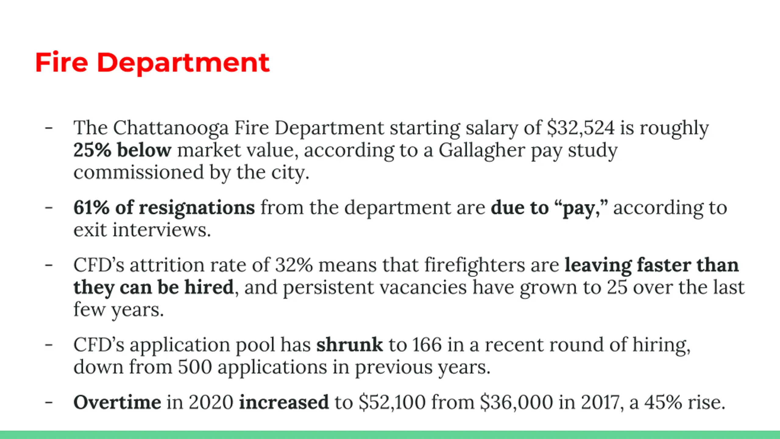 Fire Department - The Chattanooga Fire Department starting salary of $32,524 is roughly 25% below market value, according to a Gallagher pay study commissioned by the city. - 61% of resignations from the department are due to pay, according to exit interviews. - CFD s attrition rate of 32% means that firefighters are leaving faster than they can be hired, and persistent vacancies have grown to 25 over the last few years. - CFD s application pool has shrunk to 166 in a recent round of hiring, down from 500 applications in previous years. - Overtime in 2020 increased to $52,100 from $36,000 in 2017, a 45% rise.
