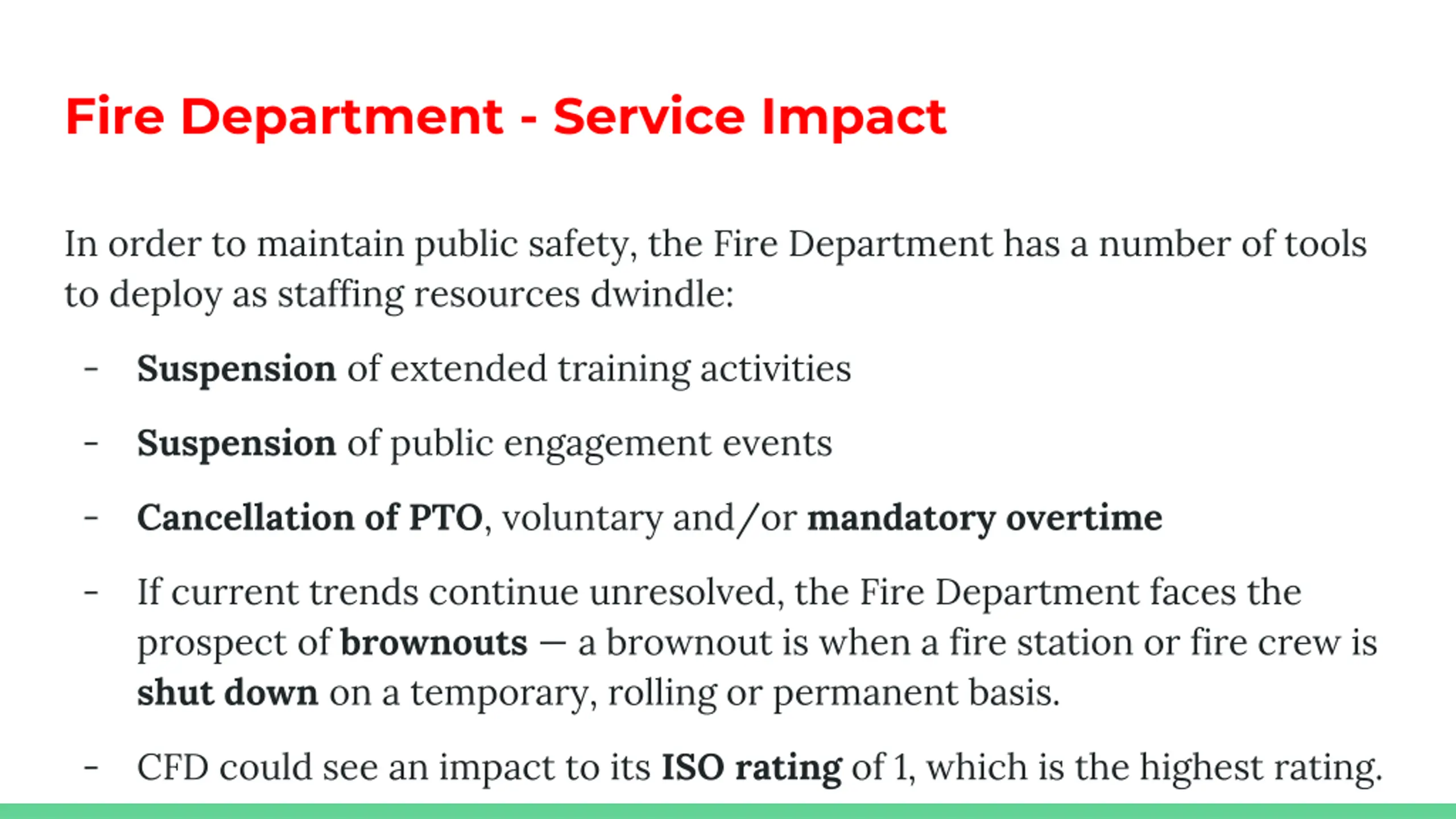 Fire Department - Service Impact In order to maintain public safety, the Fire Department has a number of tools to deploy as staffing resources dwindle: - Suspension of extended training activities - Suspension of public engagement events - Cancellation of PTO, voluntary and/or mandatory overtime - If current trends continue unresolved, the Fire Department faces the prospect of brownouts a brownout is when a fire station or fire crew is shut down on a temporary, rolling or permanent basis. - CFD could see an impact to its ISO rating of 1, which is the highest rating.